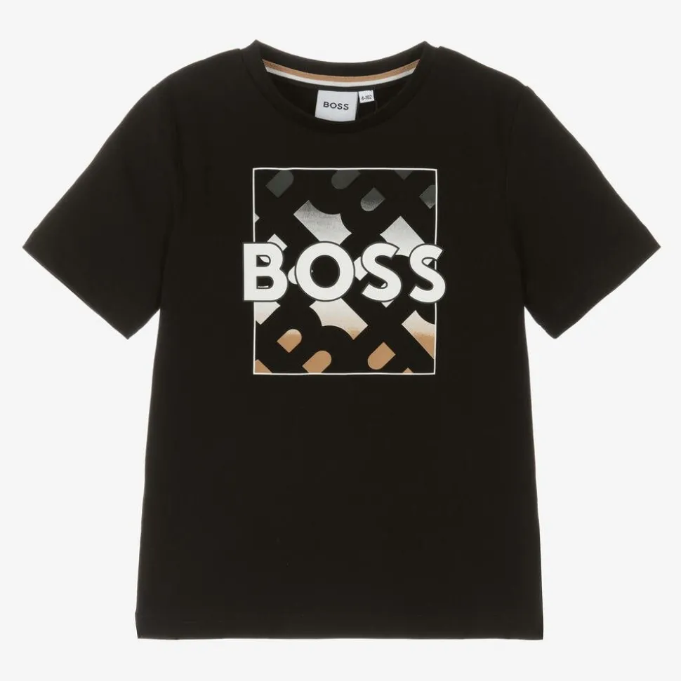 A black cotton T-shirt for boys by BOSS, with a monogram logo print on the front. This casual wardrobe staple is comfortable and soft for every day with a classic crew neck and short sleeves.