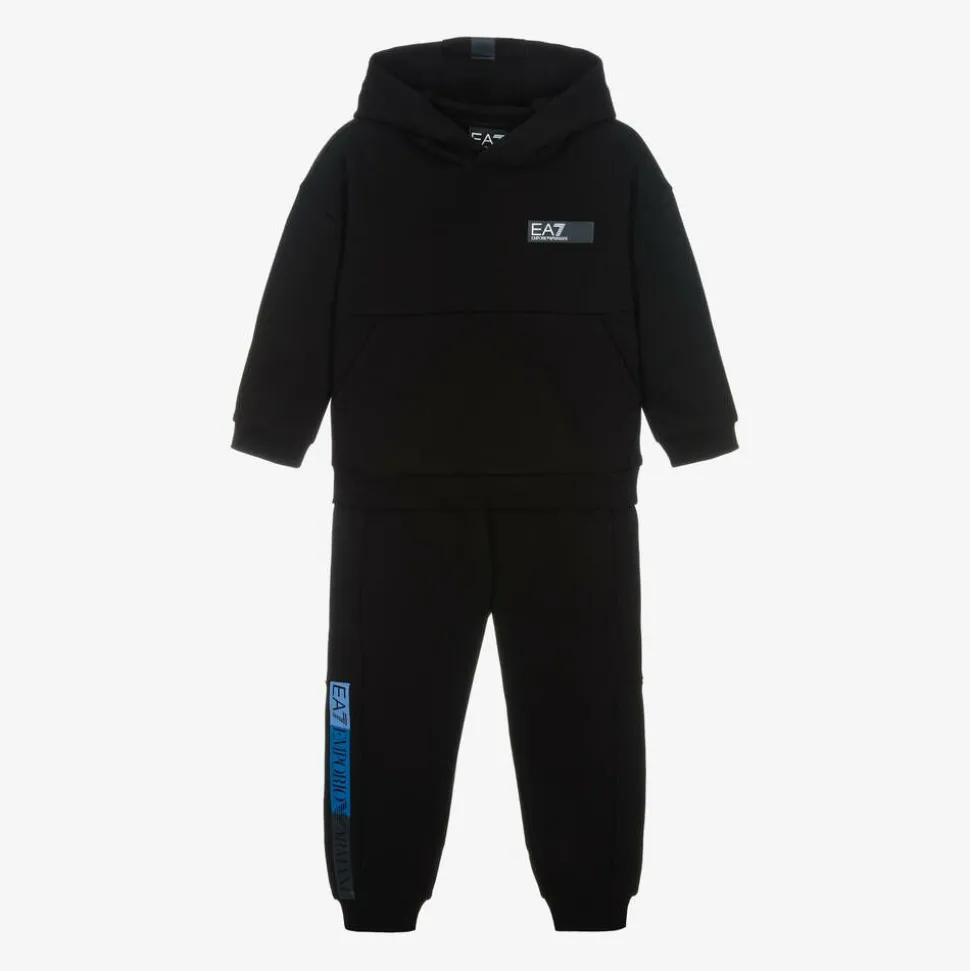Black tracksuit for boys by Italian sporty brand EA7 Emporio Armani. In a comfortable regular-plus fit, it is made in soft cotton-blend jersey with a cosy fleecy inside. The hooded top has a large pouch pocket on the front, with a signature EA7 logo on the chest. The joggers have an elasticated waist with an inner drawstring tie. There are concealed pockets on the side seams, with an instantly recognisable logo trim in blue and grey down one leg.