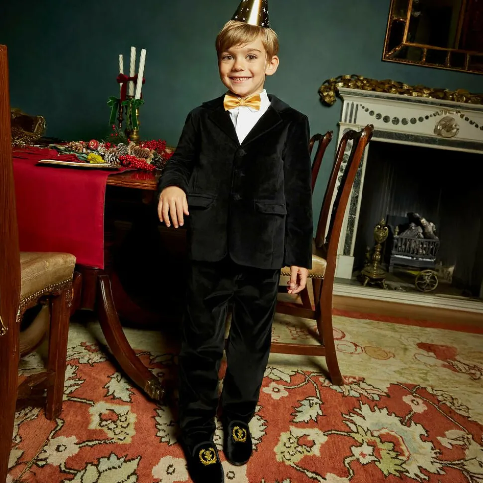 Smart black slip-on shoes for boys by Romano, made from soft velvet. Elegantly styled, they have a striking gold crest embroidered across the toes. Lined in soft burgundy red satin with a quilted insole, they have a black ribbed trim and a practical rubber outsole.