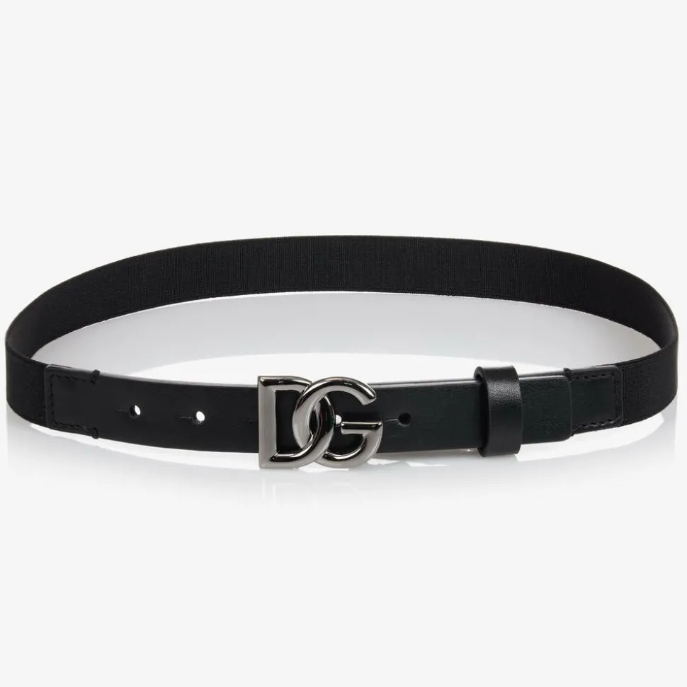 Boys slim black belt by luxury Italian designer Dolce & Gabbana. Great for an everyday smart look, it has a dark silver, metal DG logo pin buckle to fasten on the front. Trimmed with soft and smooth black leather, this belt is elasticated for a good fit.