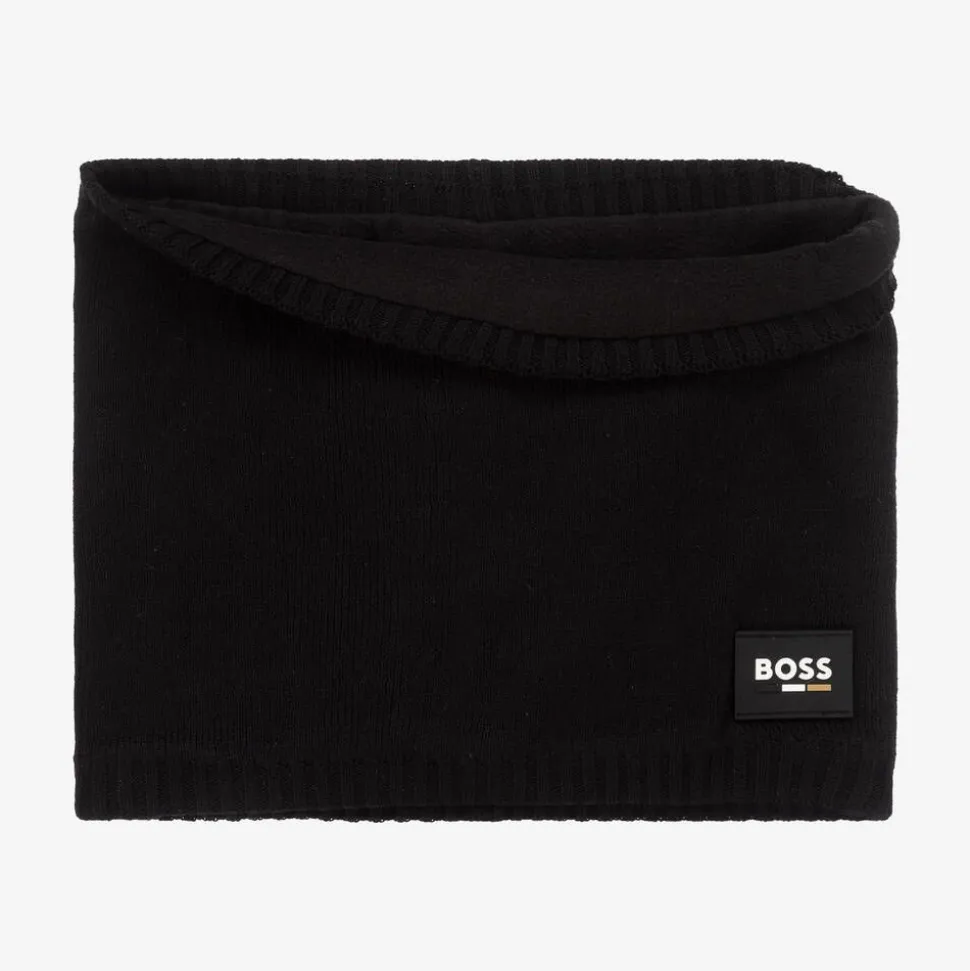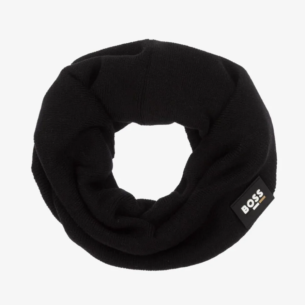 Cosy black snood for boys by BOSS, knitted in a soft wool blend. Lined in warm fleece, this cold-weather accessory has a rubberised badge on the front for a recognisable designer look.