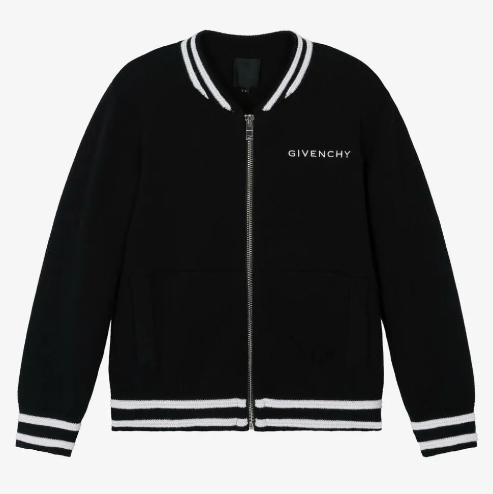 Black Mini-me zip-up top for boys by French fashion house Givenchy, with white striped trims. Beautifully soft and comfortable, it is knitted in a luxurious blend of cotton and cashmere. For brand recognition, there is Givenchy embroidery on the front, with embroidered stars and a large 4G jacquard logo on the back. A branded metal zip puller adds a finishing designer touch.