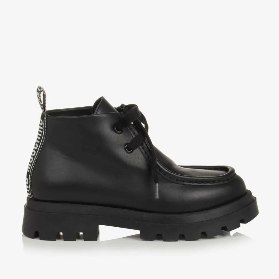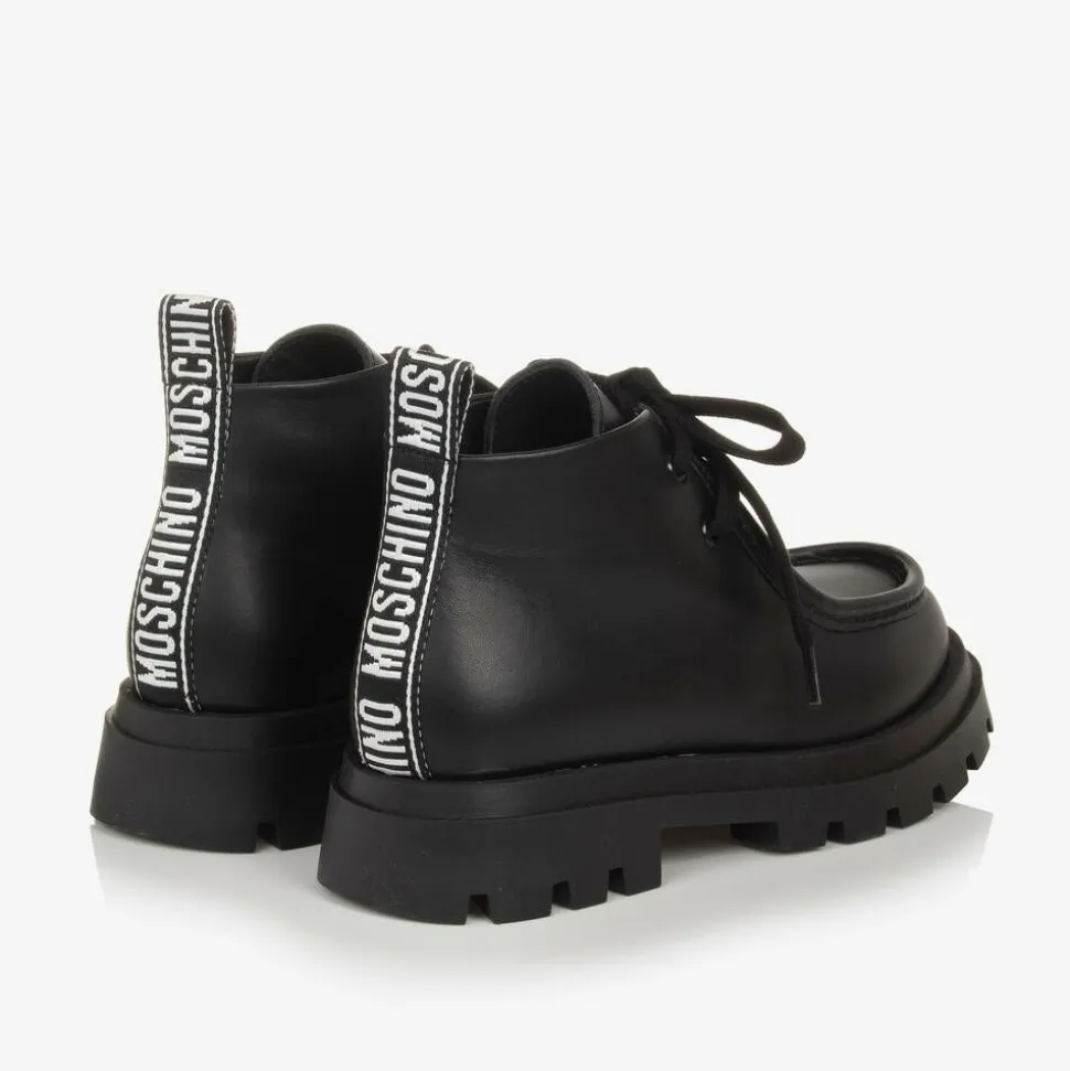 Black leather boots for boys by Italian fashion house Moschino, featuring a moccasin toe design. Lined in smooth leather for comfort, they fasten with laces and have a chunky non-slip rubber sole for good grip. They are trimmed with logo tape on the back of the heel for instant brand recognition.