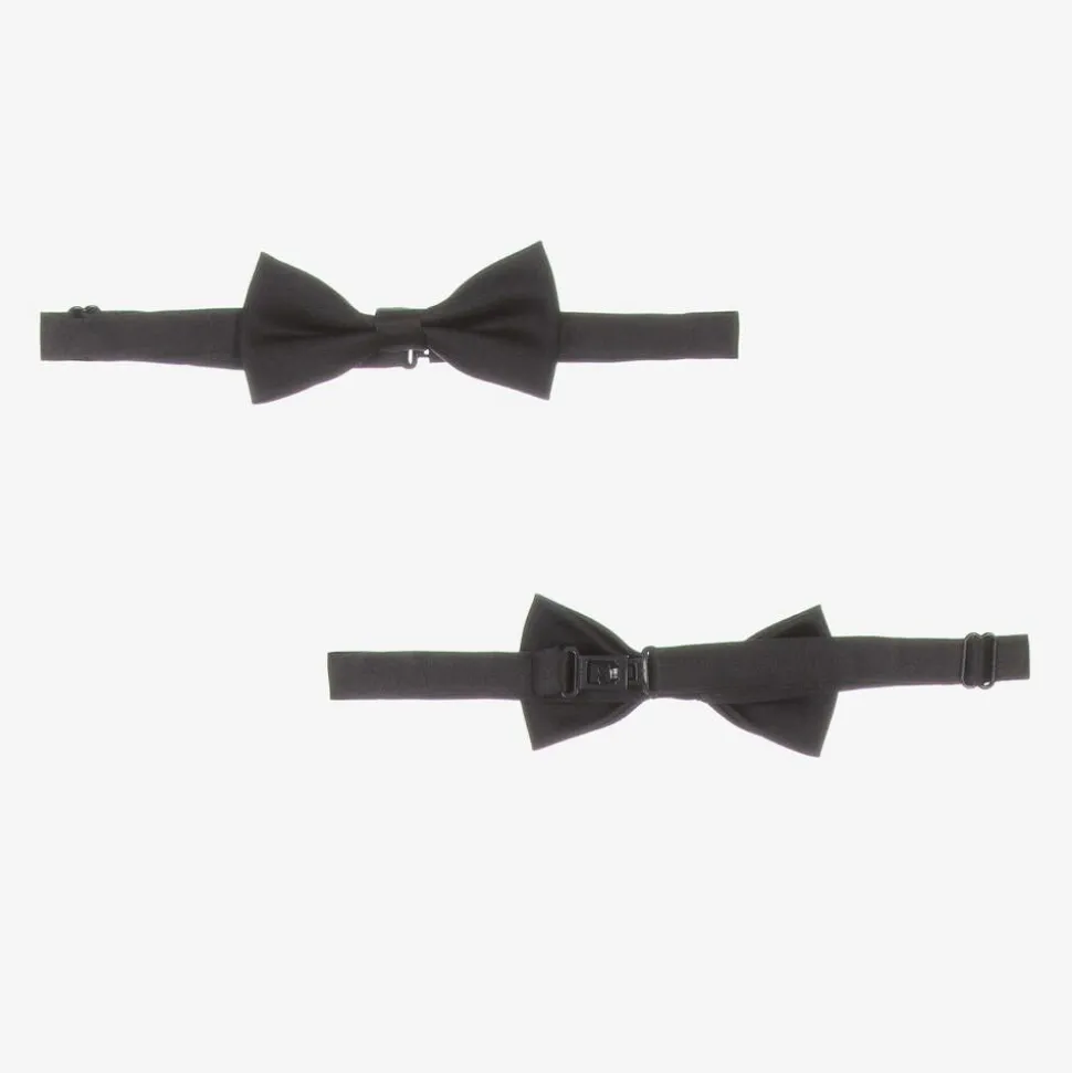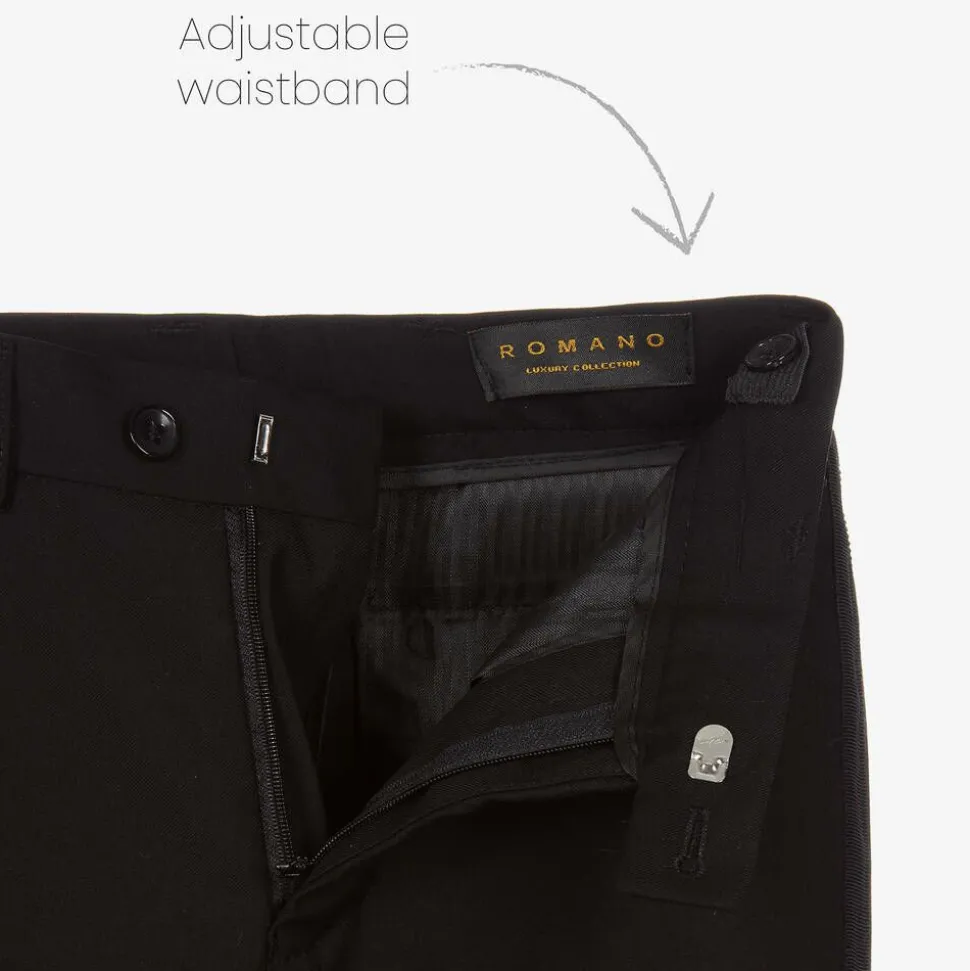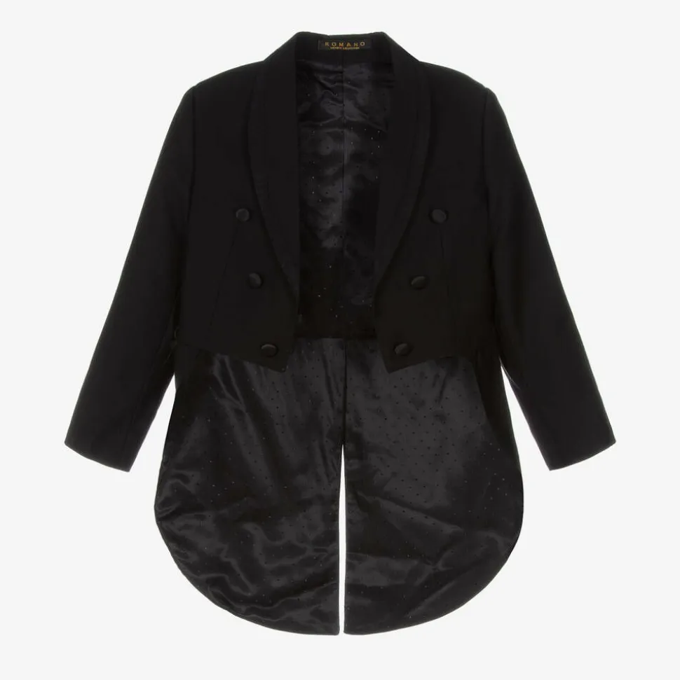 From the luxury collection, a black tuxedo suit for boys by Romano, woven in a soft cotton twill blend. Great for special occasions, the classic dress coat has long tails at the back and decorative satin buttons on the front. With a tonal polka dot lining, the shawl lapel collar is trimmed with black grosgrain fabric for added texture. The lightweight, white shirt has a pointed collar and button fastenings on the front. Smart black trousers and a coordinating satin bow tie complete the formal look.