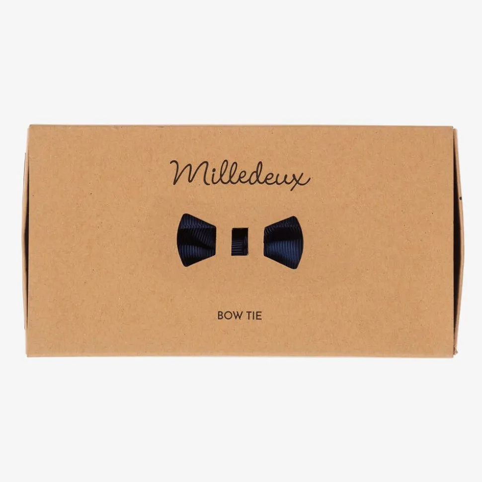 Smart navy blue bow tie for boys by Milledeux. It is made in grosgrain ribbon and has an adjustable neck strap.