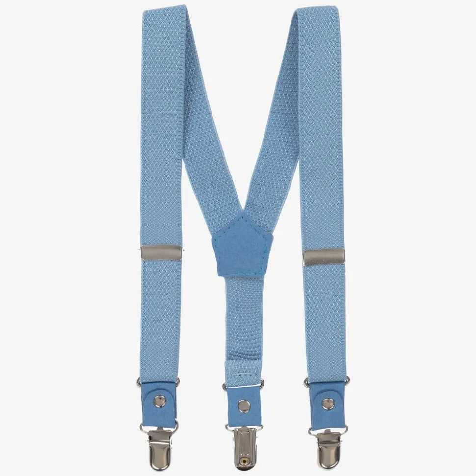 Sky blue clip-on braces for younger boys by Tutto Piccolo. They are elasticated and adjustable for a comfortable fit with silver clasps to attach to the waistband. Simply branded on the back, these versatile braces can be paired with trousers or shorts, adding sophistication to a smart or casual outfit.