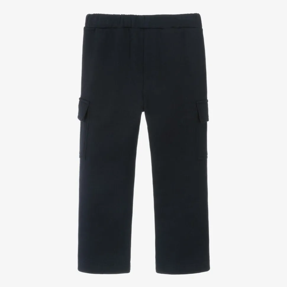 Navy blue cotton joggers for boys by Il Gufo, with cargo pockets on the legs along with side seam pockets. Made in soft, comfortable, mid-weight jersey with a cosy, fleecy inside, they have an internal drawstring waist for a great fit.