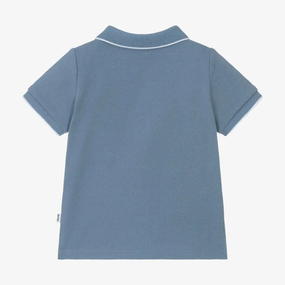 From German brand BOSS, a blue cotton polo shirt for little boys. Made in soft and comfortable piqué, this classic style has a ribbed collar and cuffs, branded button fastenings and a split hem for ease of movement. Contrasting white trims match with the logo print on the chest and there is a branded tab on the side seam to complete the designer look.