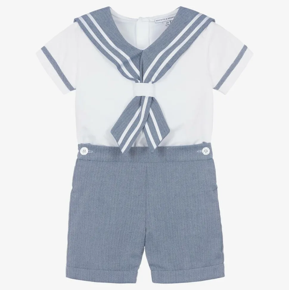 Exclusive to Childrensalon, a traditional white and blue shorts set for younger boys by British heritage brand Beatrice & George. The white shirt is made in luxuriously soft cotton, with a blue sailor collar trimmed in white grosgrain ribbon. The soft cotton-blend, blue herringbone shorts have cute turned-up cuffs, a useful adjustable waistband for a good fit and a comfortable cotton lining. The shirt buttons onto the shorts, keeping boys neat and tidy.