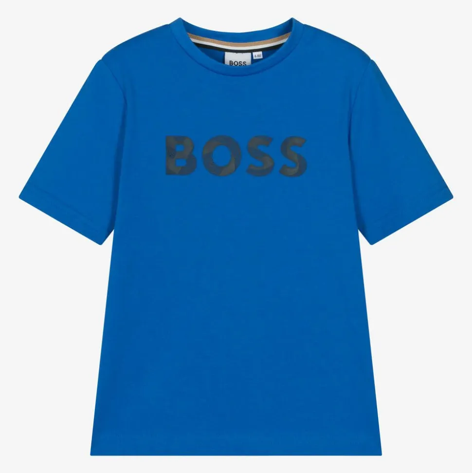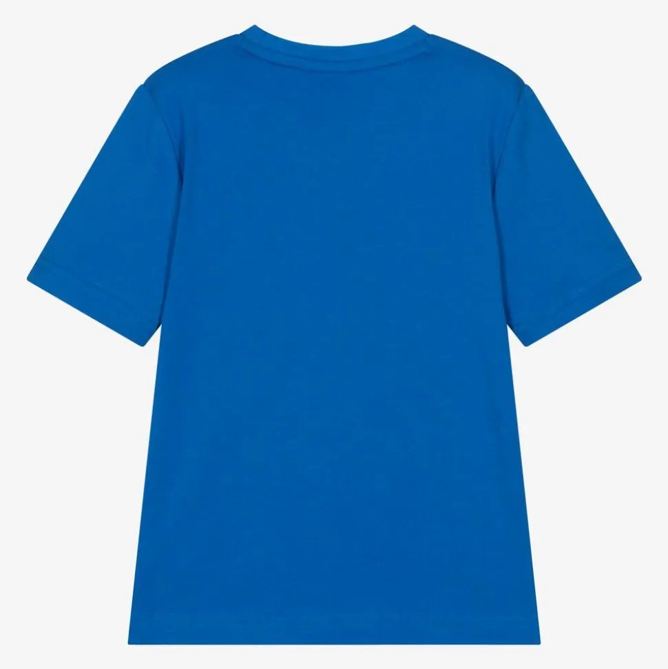 Cool bright blue cotton crew neck T-shirt for boys by BOSS, made in soft jersey. This comfortable everyday wardrobe staple has short sleeves and a rubberised blue BOSS logo on the front.