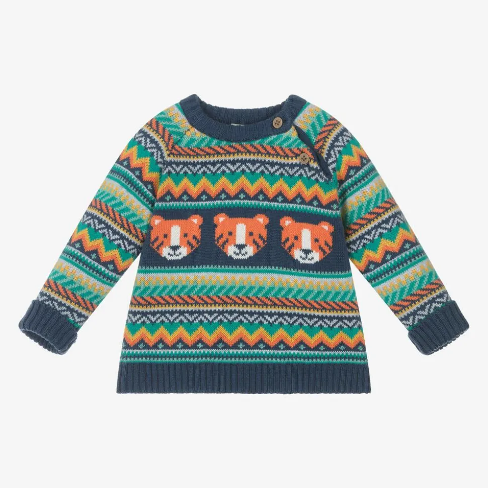 Navy blue sweater for boys by Frugi, with an intricate intarsia pattern. Accented by orange, green and yellow, the classic Fair Isle design is reimagined with cute and friendly tigers. It is made in a super-soft, chunky, organic cotton knit for comfort and cosiness. Smaller sizes fasten with natural buttons on the front to help with dressing your little one.