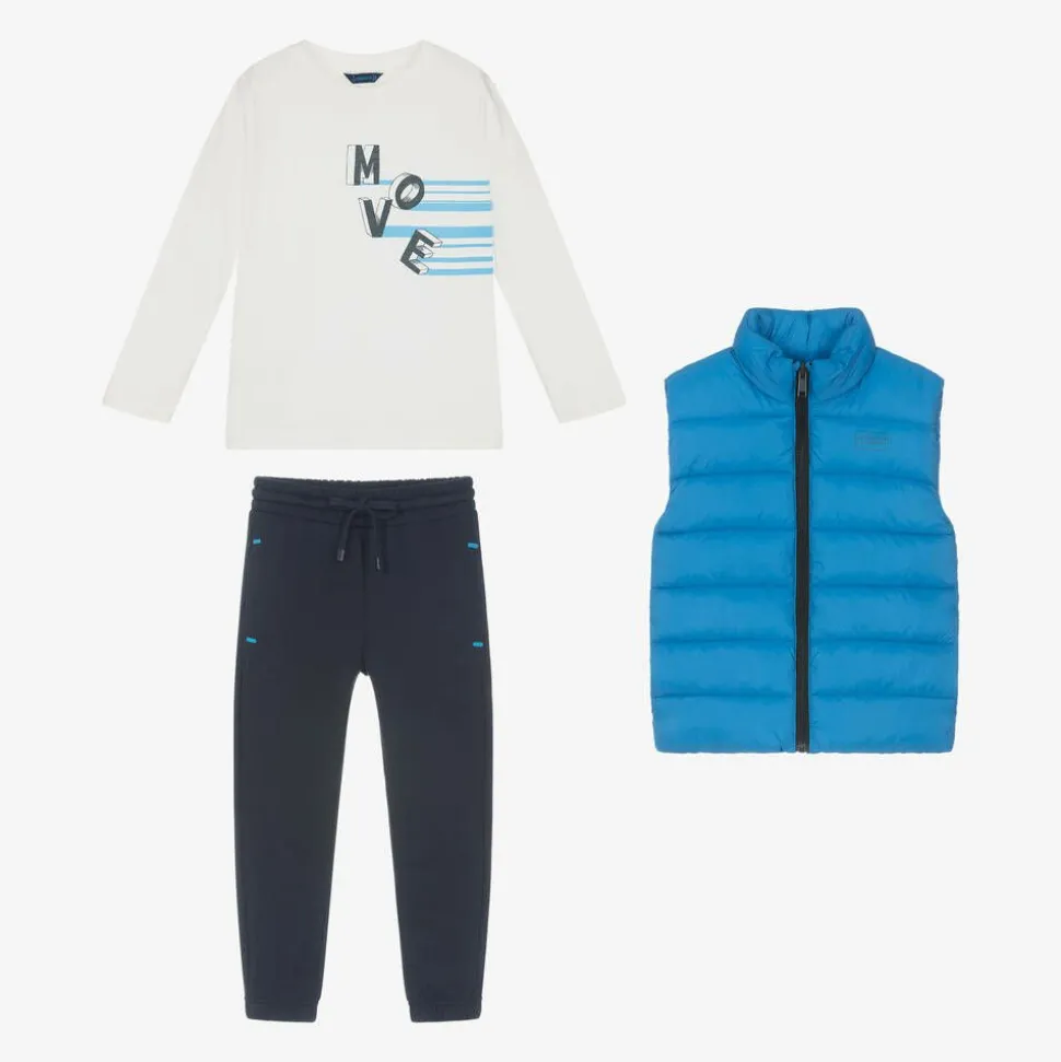 Casually styled, this blue trouser set for boys is by Mayoral. Smooth with a silky lining, the lightly padded high-neck gilet fastens with a zip on the front and has a 'Let's Move' motif on the chest. Made from soft cotton jersey, the ivory long-sleeved top is printed with a bold 'Move' design. A pair of navy blue cotton-blend joggers complete this laid-back look. They have a cosy fleecy interior, extra durable knees, side seam pockets, and a comfortable drawstring waist.