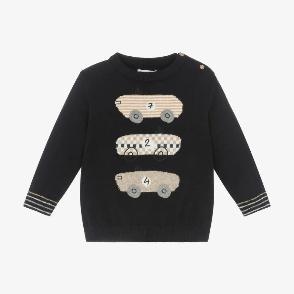 Cosy and comfortable for little boys, this navy blue sweater is by Mayoral. Knitted in a soft blend of cotton and wool, it has striped ribbed cuffs, and features a trio of vintage racing cars on the front. There are button fastenings on one shoulder to help with dressing.