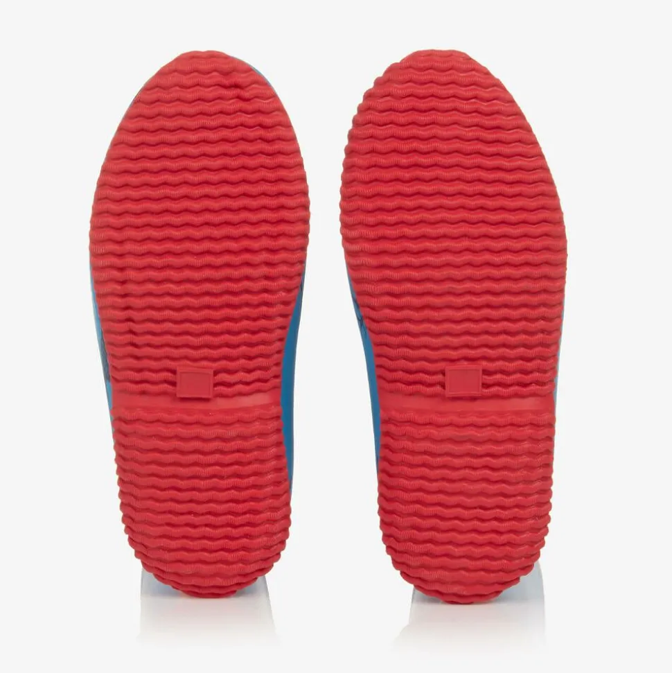 Blue slip-on rain boots for boys by Hatley, with a navy blue elk pattern and bright red trims. Made from smooth and flexible rubber, they are foldable for easy storage and have a soft jersey lining with a removable, lightly padded insole for comfortable wear. They have reflective logo details on the front for a branded finish. The non-slip rubber outsole is ridged for good grip.