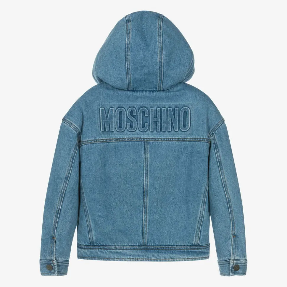 Blue denim jacket for boys by luxury Italian brand Moschino Kid-Teen, with a large, embossed logo on the back for instant brand recognition. The jacket has a washed and worn look, and is super cosy with a brown teddy fleece lining and hood. It has branded popper fastenings on the faux chest pockets a well as the hand pockets, with further branded detailing on the zip fastening.