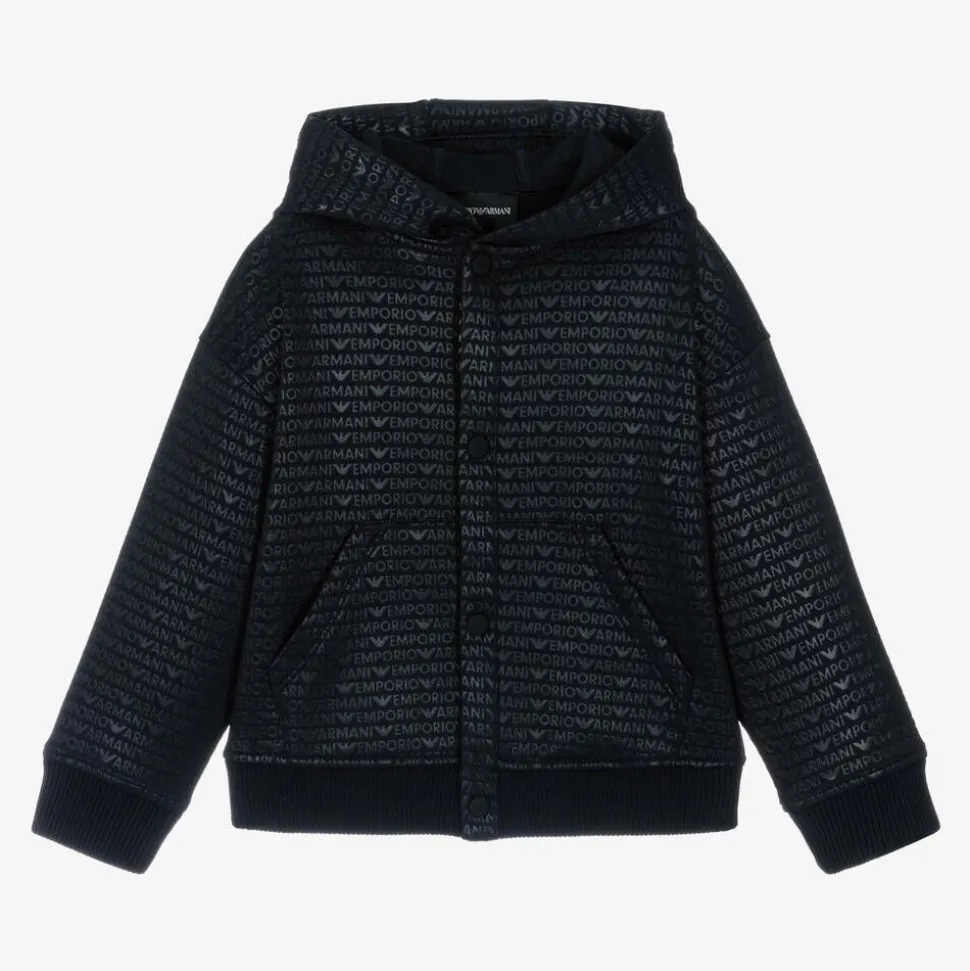 A navy blue sweatshirt-style cardigan for boys by Italian designer Emporio Armani. This cool top is made in a mid-weight cotton blend jersey, with all-over tonal branding for a distinctive look. It has a ribbed hemline and cuffs, and logo popper fastenings on the front. There is a fixed hood and hand warmer pockets for extra cosiness.