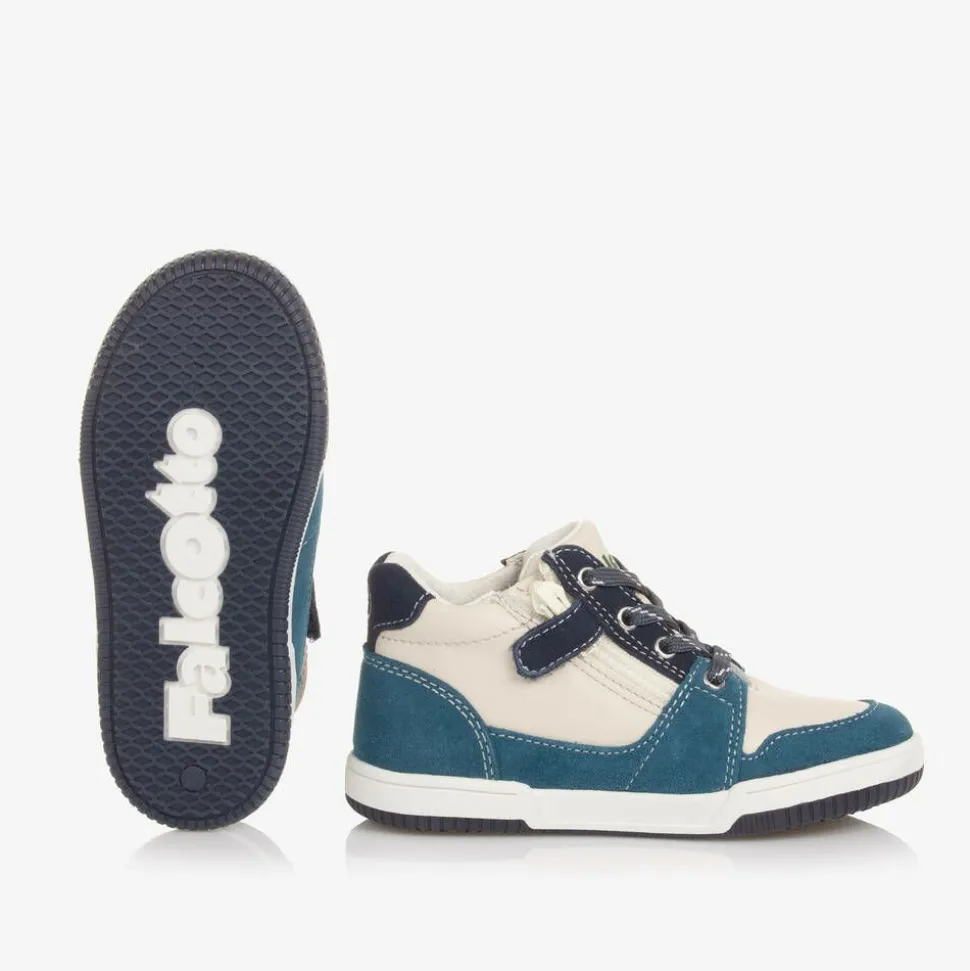 Designed in soft blue suede and smooth ivory leather, these stylish trainers for boys by Falcotto by Naturino, have a green star appliqué on one side. Supporting growing feet, they are comfortably lined in soft leather, with a lightly cushioned insole and non-slip rubber outer sole. They fasten with a zip on one side and have laces to ensure a secure fit.