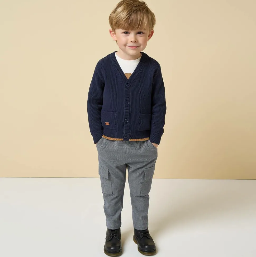 Navy blue cardigan for boys by iDO Baby, knitted in a ribbed cotton blend. Trimmed with tan brown piping, this layering piece has pockets on the front and simply fastens with buttons. A small logo badge completes the look with a subtle touch of branding.