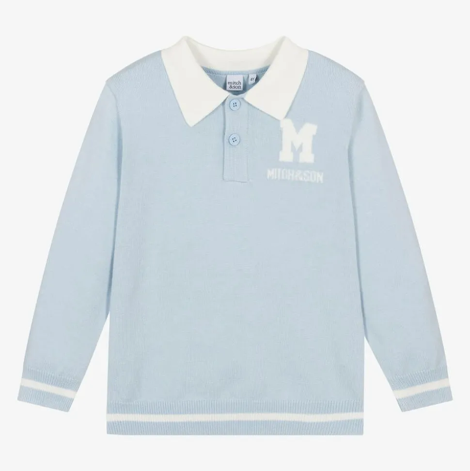Pale blue sweater for boys by Mitch & Son, made in a soft knit. Styled like a polo shirt, it has a white collar and button fastening on the front for a fun stylish twist on a classic item.