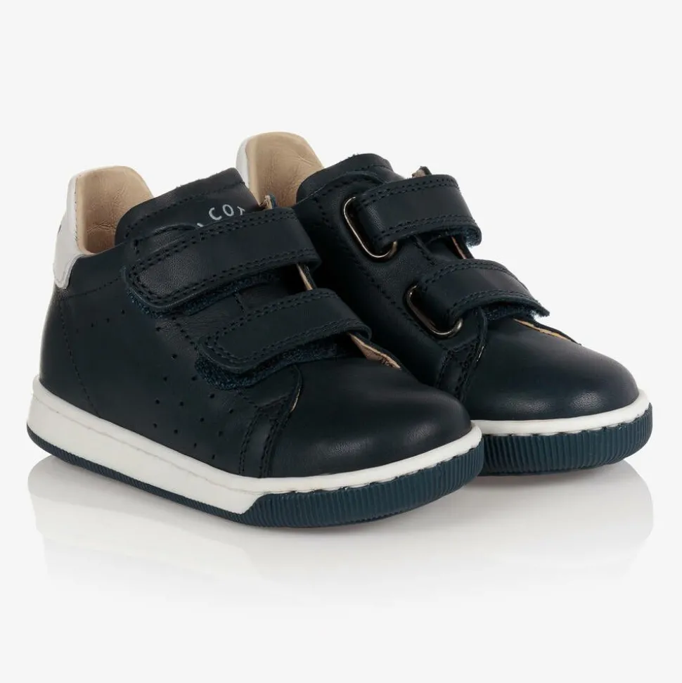 Navy blue with white trims, these logo-branded trainers for little boys are by Falcotto by Naturino. They are made and lined in super soft leather, with a rubber sole for good grip. They fasten with double velcro straps and the special reinforcement on the heel gives just the right support to growing feet.