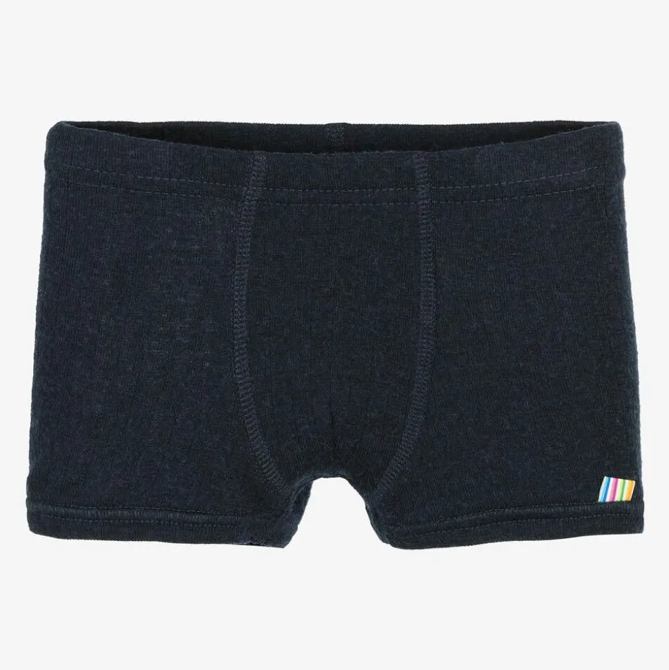Navy blue thermal boxer shorts for boys by Joha, made from a luxurious, soft and lightweight Merino wool jersey. Comfortable to wear, they have an elasticated waistband and feature a striped rainbow logo tab on the front.