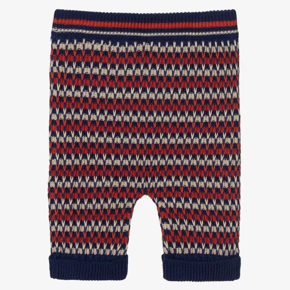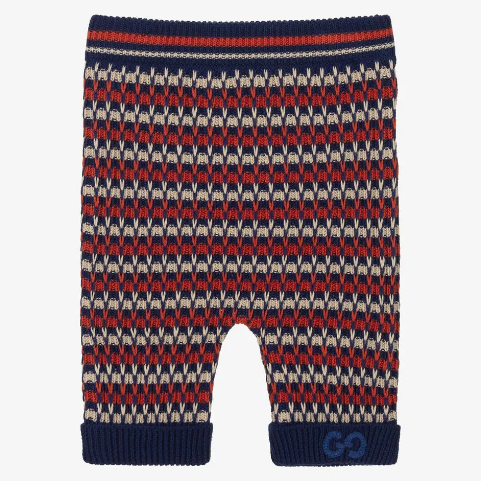 Little boys navy blue and red trousers by luxury Italian designer Gucci, expertly knitted in soft cotton. Inspired by a retro colour palette, these cute bottoms have a striped orange and white style. Subtle, yet stylish, they have the House's instantly recognisable GG logo embroidered onto one cuff and an elasticated waist for comfort.