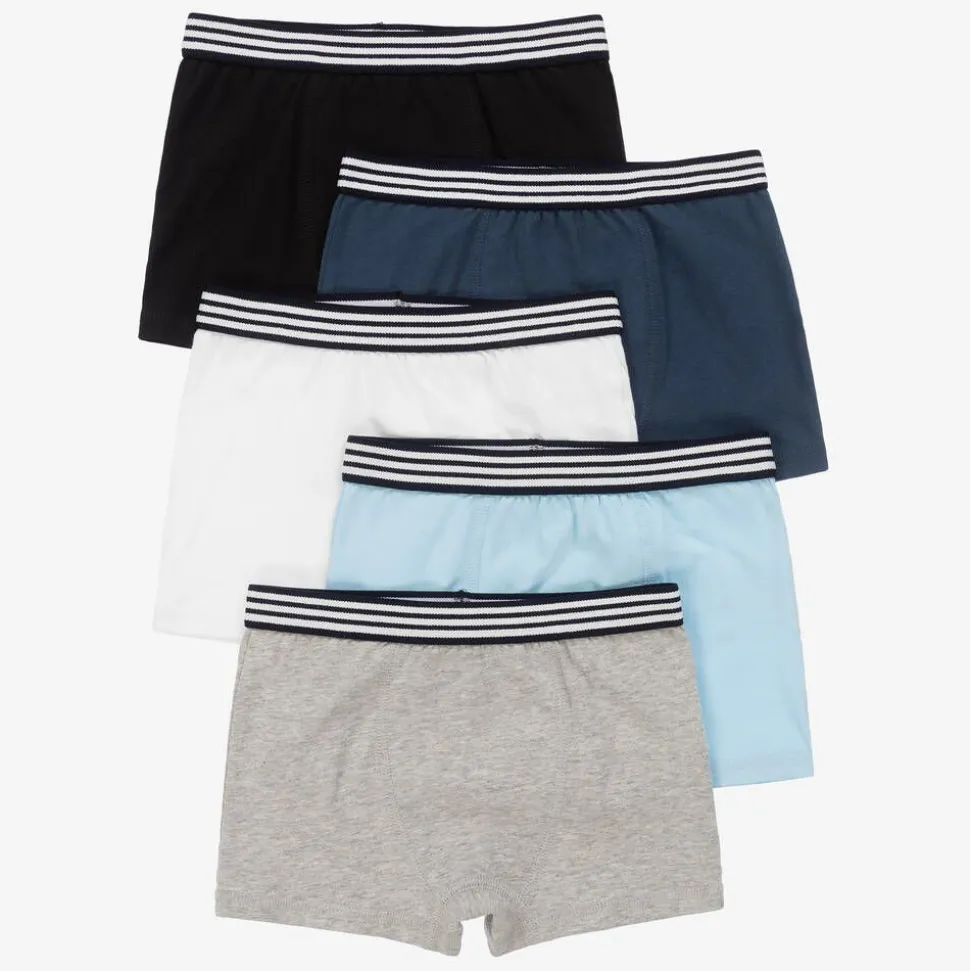 Pack of five organic cotton boxer briefs for boys by Childrensalon Essentials, in shades of blue, black, grey marl and white. Soft and comfortable, they are made in stretchy jersey with black and white striped, elasticated waistbands.