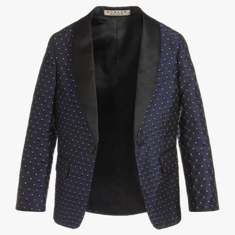 Boys special occasion suit by Romano. It has a patterned blue satin jacket and waistcoat, with plain black trousers. The waistcoat can be adjusted on the back and the trousers have piped satin side seams and an elasticated waistband.