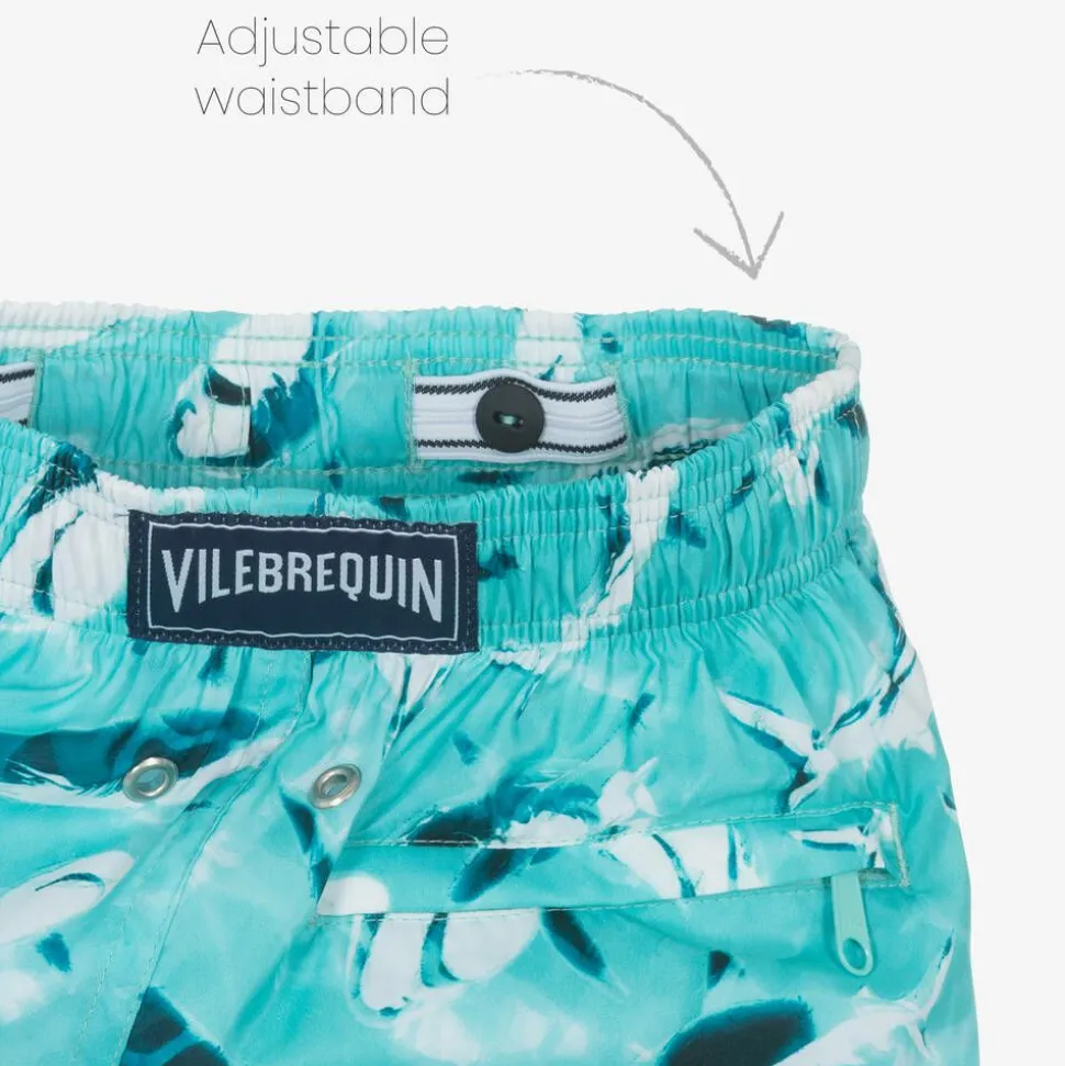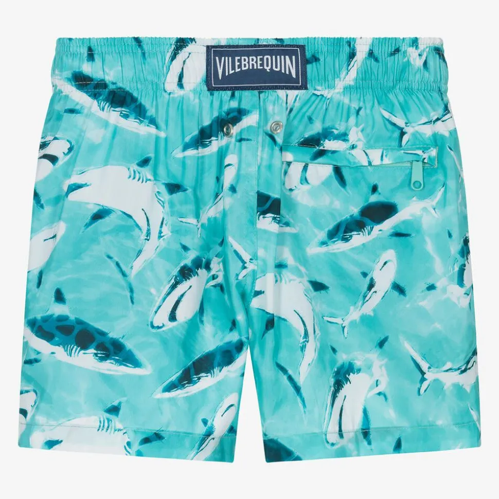 Patterned in a cool shark print, these aqua blue packable swim shorts for boys are by Vilebrequin. Silky and lightweight, they have a fine mesh lining and concealed side seam pockets, with a zipped back pocket into which the shorts can be tucked away. The elasticated waistband is adjustable and has a faux drawstring detail. A branded label at the back adds a finishing designer touch.