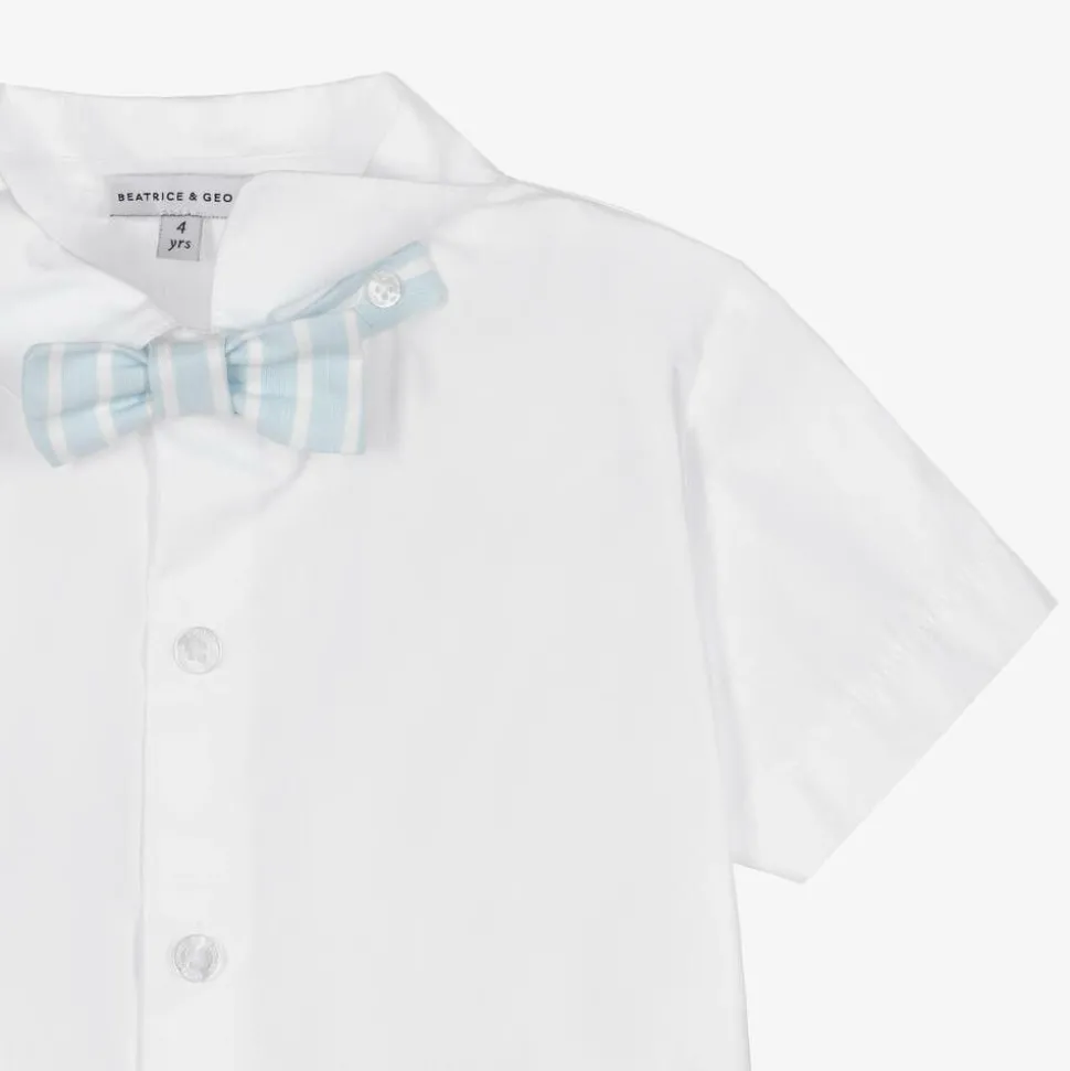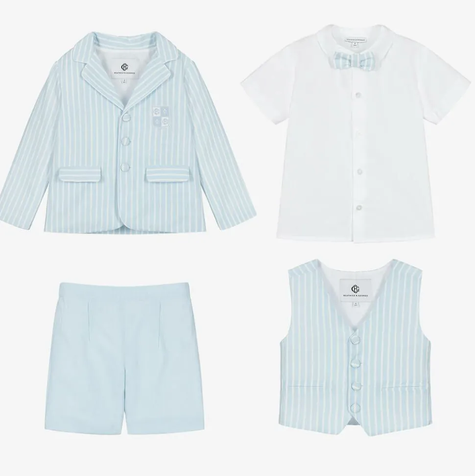 Smart pale blue five piece shorts suit for boys by British heritage brand Beatrice & George, exclusive to Childrensalon. Made in a cool cotton and linen blend, the jacket is boldly striped in white, with fabric-covered button fastenings, an embroidered crest logo badge and pockets on the front. It is lined in white satin for comfort and comes with a matching waistcoat. The lined, pale blue shorts have an adjustable waistband that is elasticated around the back for a good fit. A white cotton shirt and a detachable, striped bow tie complete the look.