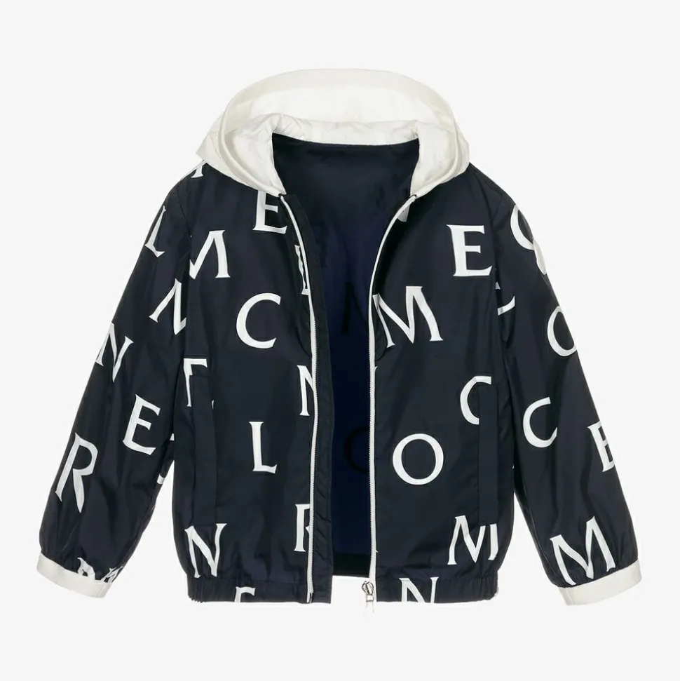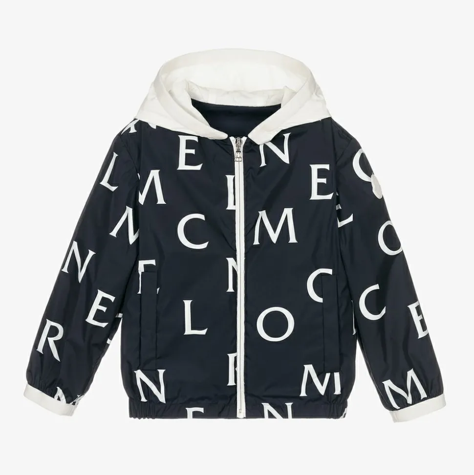 Boys navy blue zip-up windbreaker jacket by luxury brand Moncler Enfant. Smooth and lightweight, it has a white all over logo lettering print and a white silicone logo patch on one sleeve. The ivory hood is lined for comfort and has a soft elasticated trim to match the sleeve cuffs. There are popper fastening pockets on the front.