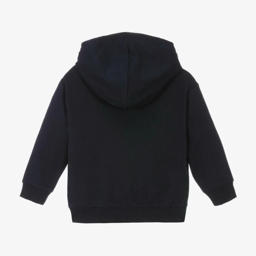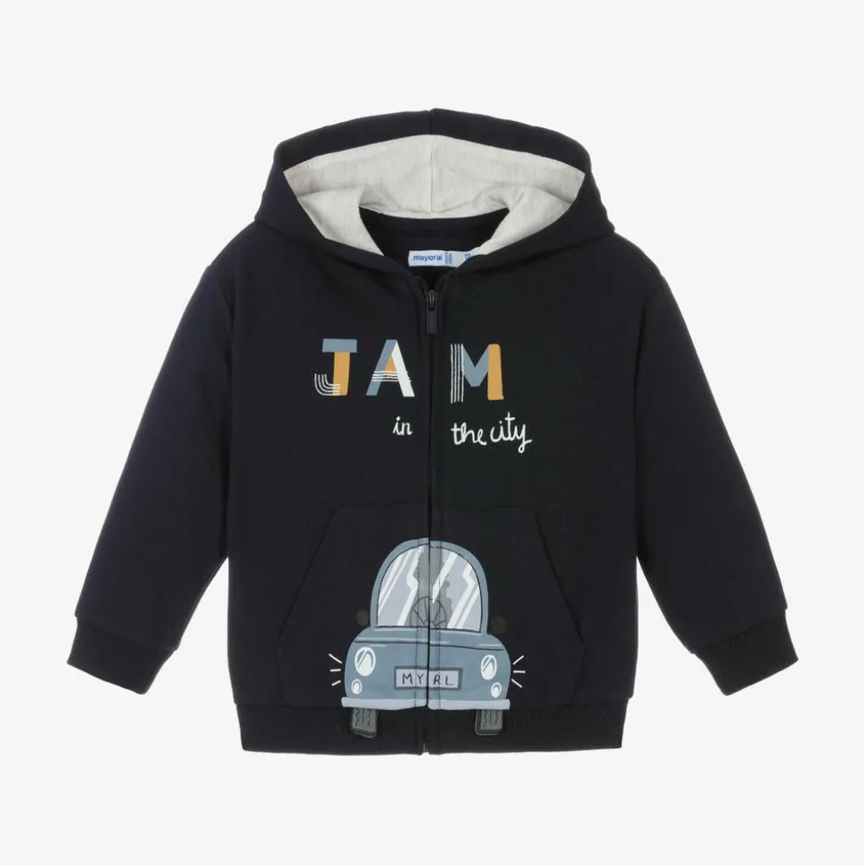 Casual zip-up top for little boys by Mayoral, in navy blue. Made in soft cotton-blend jersey, it has a fixed hood lined in contrasting beige marl, with ribbed trims for added cosiness. The words 'Jam in the city' are printed in beige and blue on the front, with a fun car print on the pouch pockets.