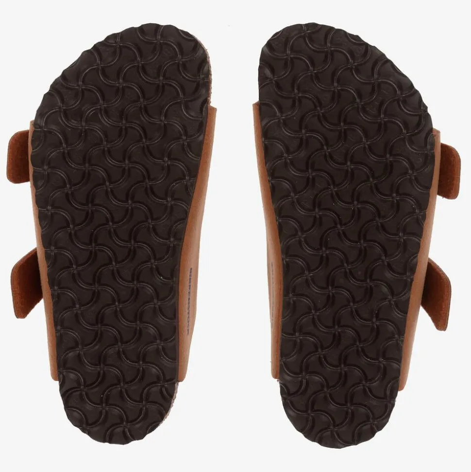 Mid-brown slip-on sandals for boys by German brand Birkenstock, made with durable Birko-FlorĀ® soft faux suede. Comfortable and animal-free, these narrow-fit Arizona sandals have an anatomically contoured footbed, lined in soft faux leather for comfort, The straps fasten with adjustable buckles across the foot for a good fit. They have a non-slip rubber outsole to improve grip on the go.
