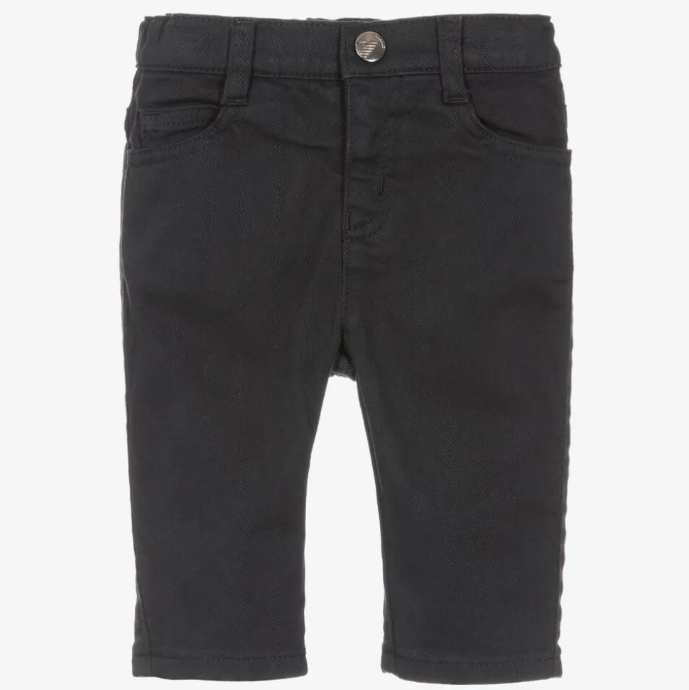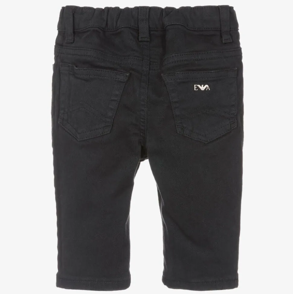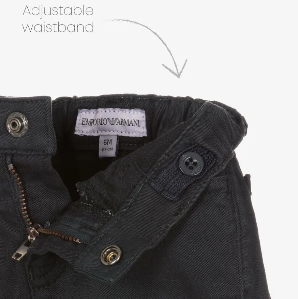 Dark blue trousers for little boys by Emporio Armani, made in soft cotton twill with a hint of stretch. For a signature look, they have a branded popper on the front and a metal logo plate on the back. Designed in a five pocket style, they have an adjustable waist for a good fit.
