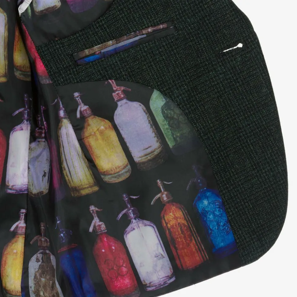Boys three-piece Mini-me Caridi suit by House of Cavani, traditionally styled in a dark green and black check. The jacket has black velvet trims and branded button fastenings. There is a removable navy blue floral pin with a silver chain and logo pin on the lapel for a contemporary twist. Both the jacket and blue satin-backed waistcoat have colourful bottle-patterned satin lining. The trousers have jetted front pockets, a buttoned back pocket and a part elasticated waist for a good fit.