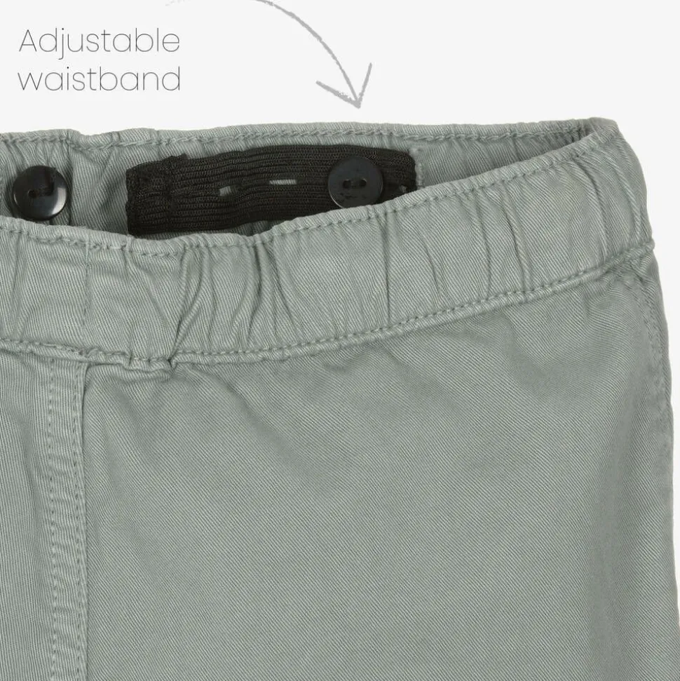 Sea green cargo trousers for boys from iDO Baby, made in super-soft, slight-stretch cotton twill. With cuffed ankles, these five-pocket trousers have an adjustable, drawstring waist to provide the best fit. They have utility pockets for a laid-back look.