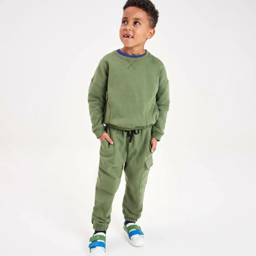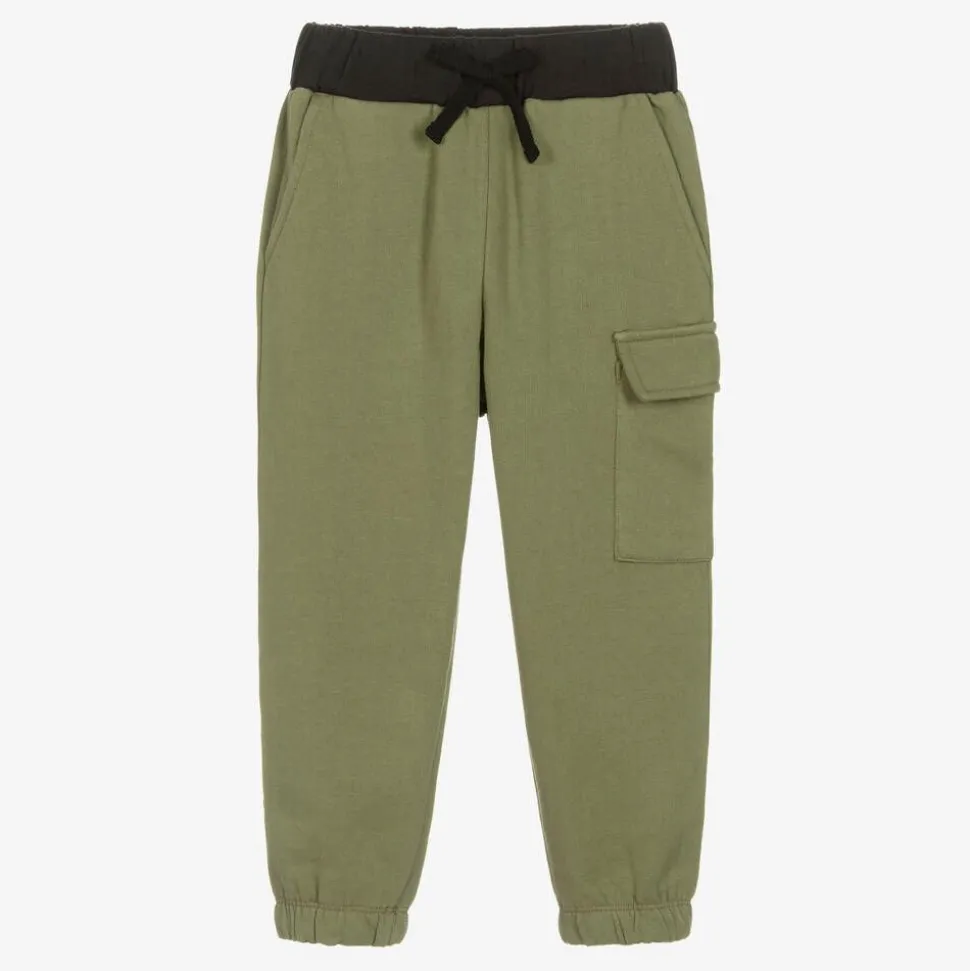 Khaki green cotton joggers for boys by British brand Joyday, exclusive to Childrensalon. Just right for casual days, they have a relaxed fit and are made in stretchy jersey with a cosy, fleecy inside and gently elasticated cuffs for extra cosiness. There are slanted front pockets, a cargo-style pocket on one leg and a useful drawstring on the black, elasticated waistband for a good fit.