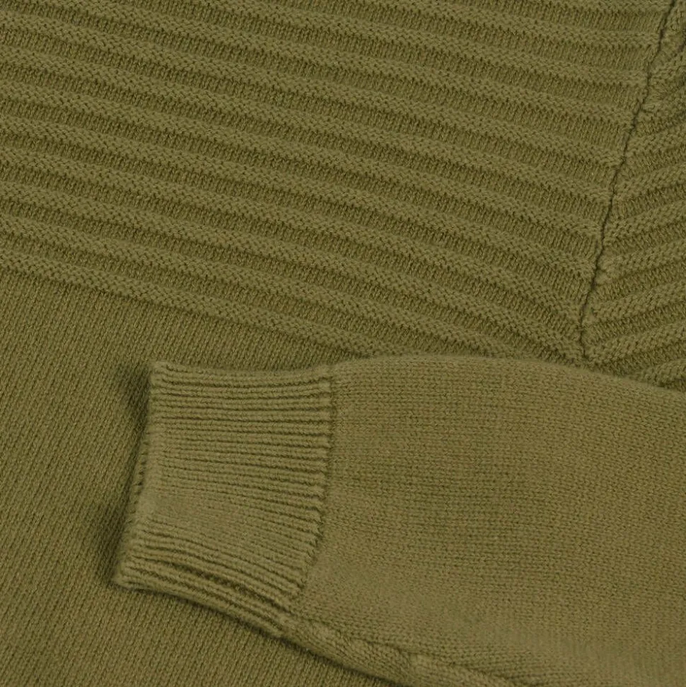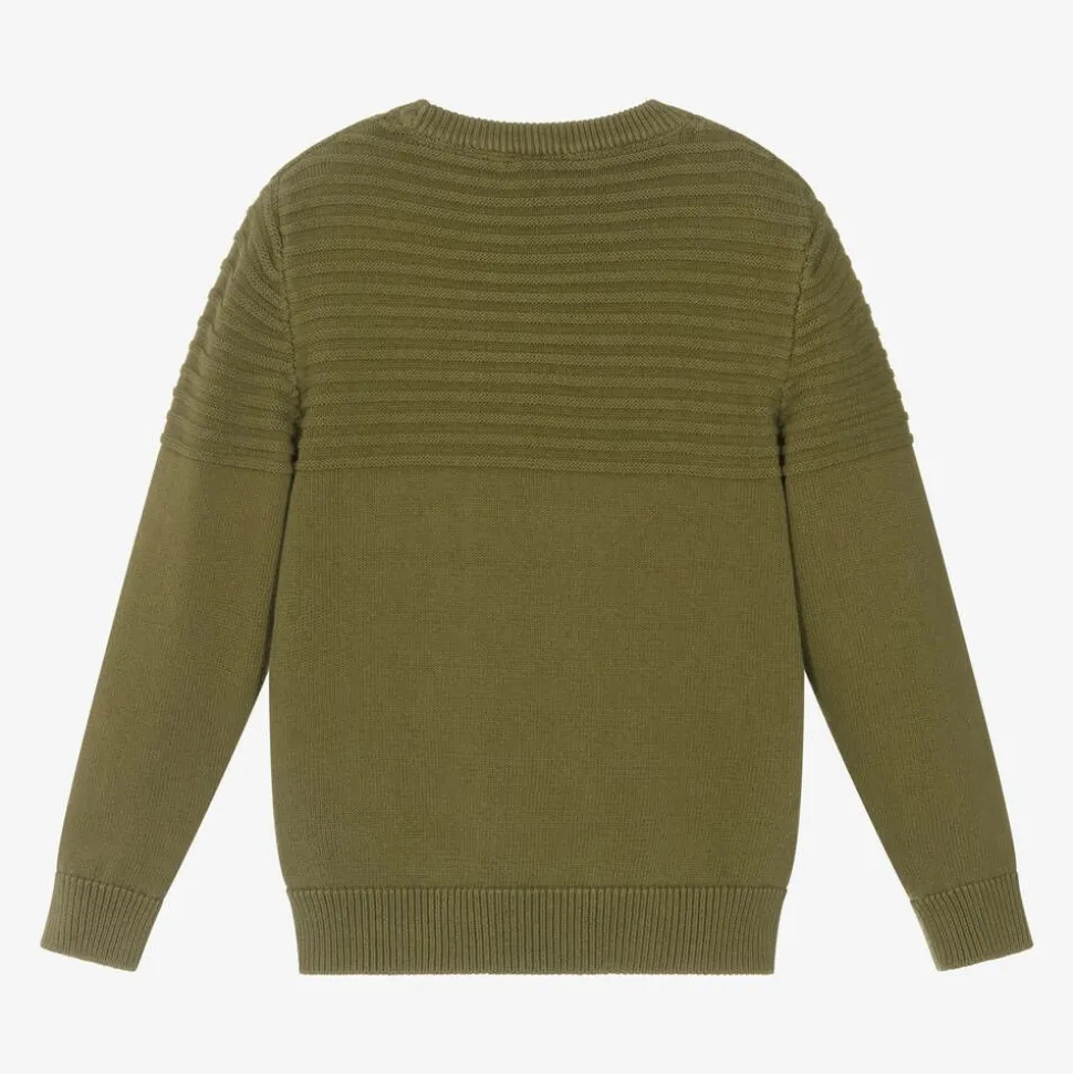 Khaki green sweater for older boys by Mayoral Nukutavake, knitted in soft cotton. Ideal for those cooler days, this warm piece has ribbed knit detailing across the top and a casual crew neckline.