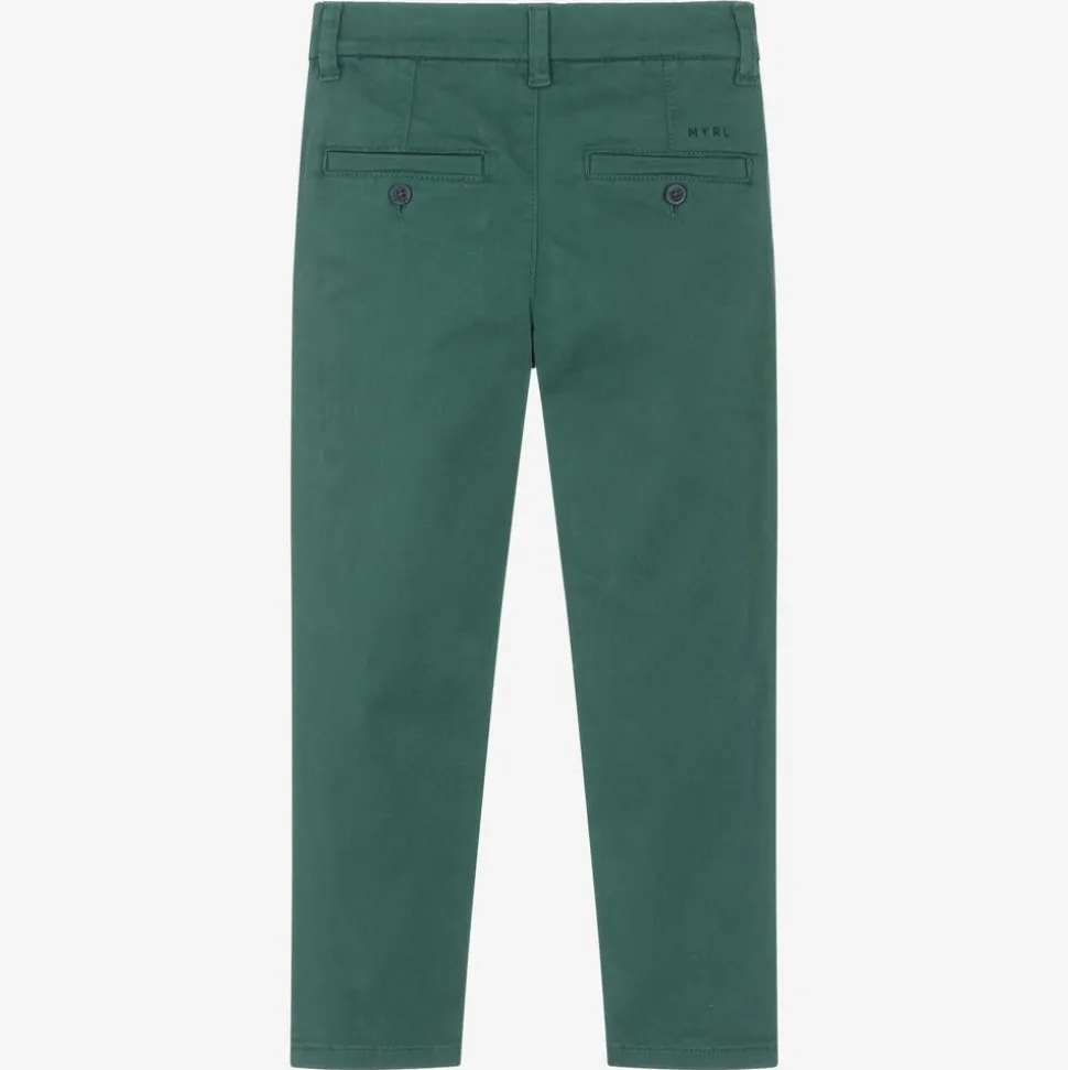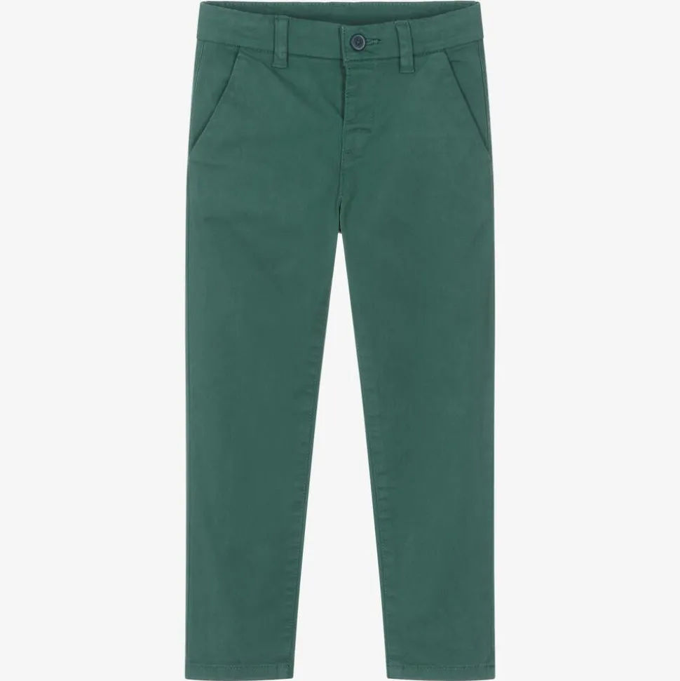 Green chino trousers for boys by Mayoral, designed in a slim fit. Made in soft cotton twill, these smart-casual bottoms fasten with a button and have an adjustable waist for a great fit. They have two slanted pockets on the front, with an embroidered logo above one of the button-fastening back pockets.
