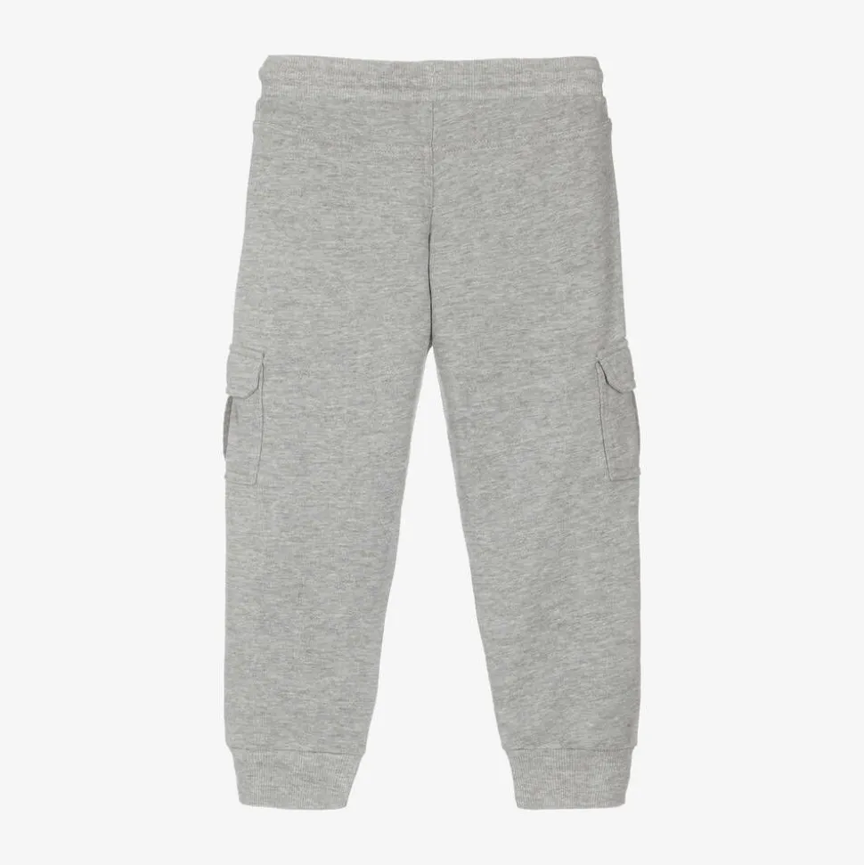 Grey marl joggers for boys by Boboli, made in a soft cotton-blend jersey. For a cool style, they have two cargo pockets and a brown logo patch on the front. The stretchy drawstring waist ensures a comfortable fit.