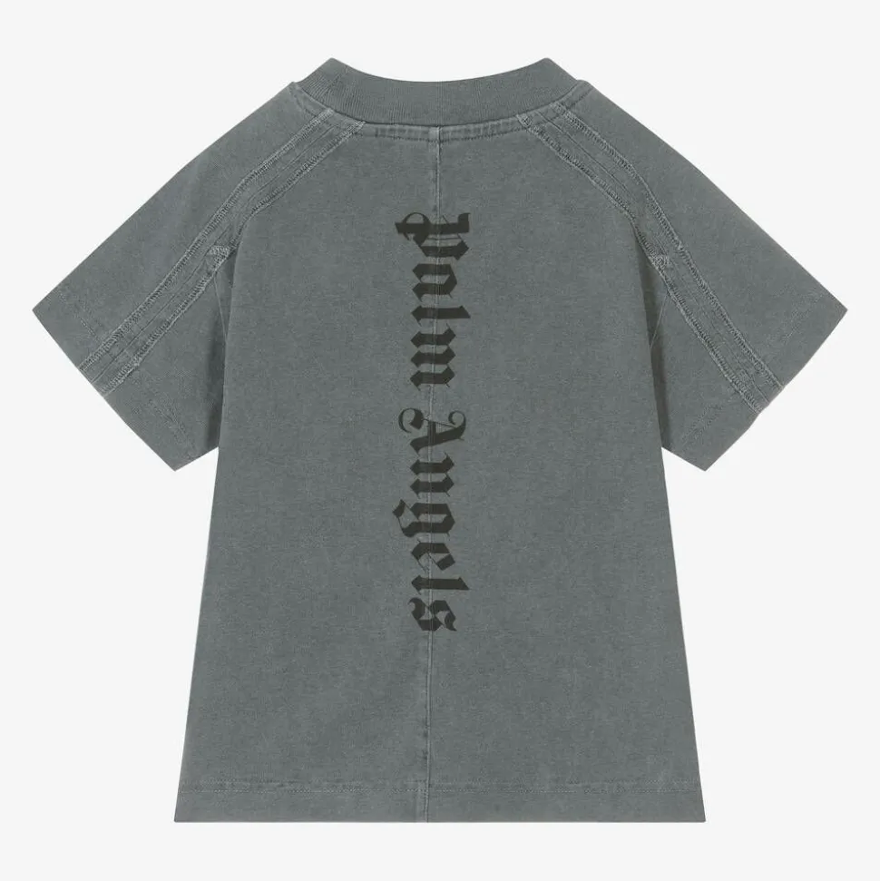 Cool grey cotton shaded T-shirt for boys by Italian brand Palm Angels. For instant brand recognition, there is a black Palm Angels logo printed on the front and a large, vertical logo on the back. Made in soft, comfortable jersey, it has a V-insert below the ribbed, crew neck, with overstitch detailing on the raglan sleeves and panels on the sides.