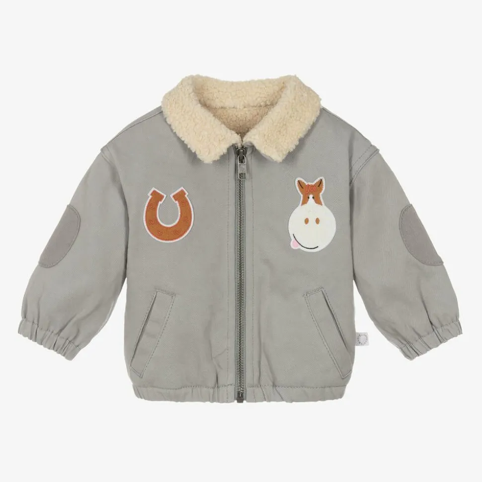 A cool grey jacket for little boys by Stella McCartney Kids, made in organic cotton twill with a denim look. Lined with soft sherpa fleece, this mid-weight jacket has elbow patches on the sleeves and equestrian-themed appliqués on the front. The cheeky horse motif incorporates the designer's circular logo. It has two front pockets and a collared neckline. The full-length zip and the elasticated cuffs help to lock warmth in on chilly days. The Stella McCartney fit can be quite small so choose a size up if you want room to grow.