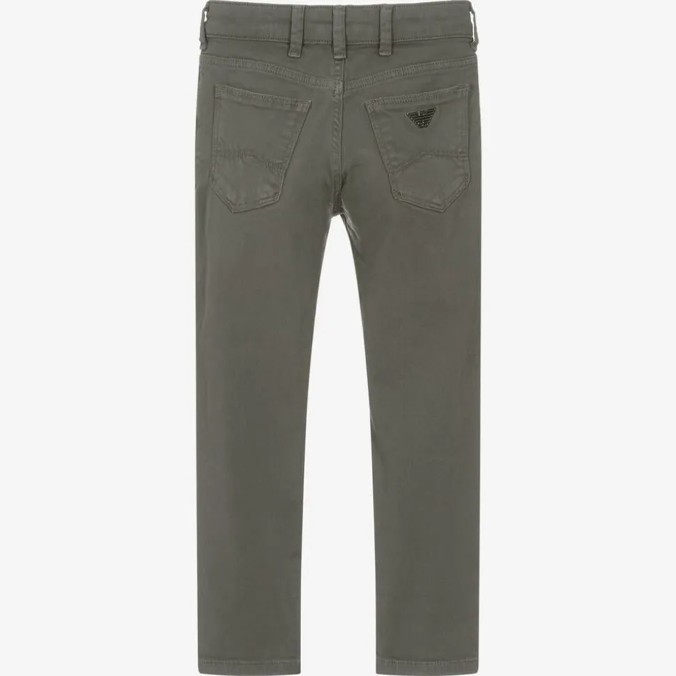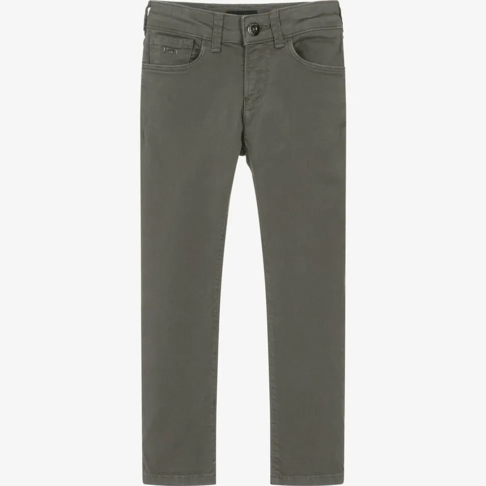Dark grey jeans for boys by Emporio Armani, made in soft cotton twill with added stretch for comfort. In a classic five-pocket style, these slim fit trousers have an adjustable waist for an ideal fit, with a button and zip fastening. Branded metal hardware on the back and front adds a signature designer touch.