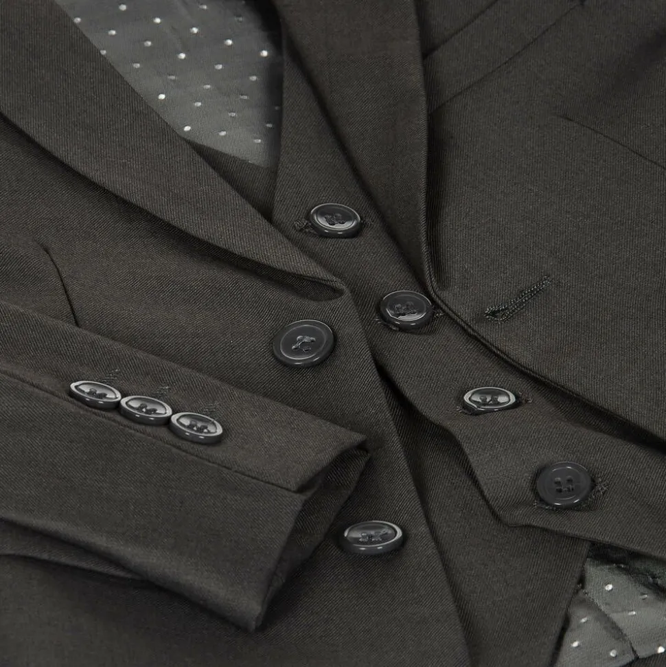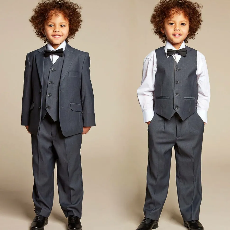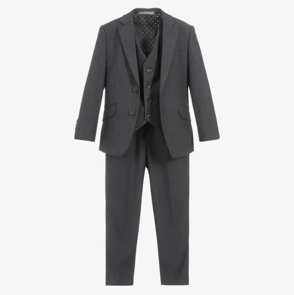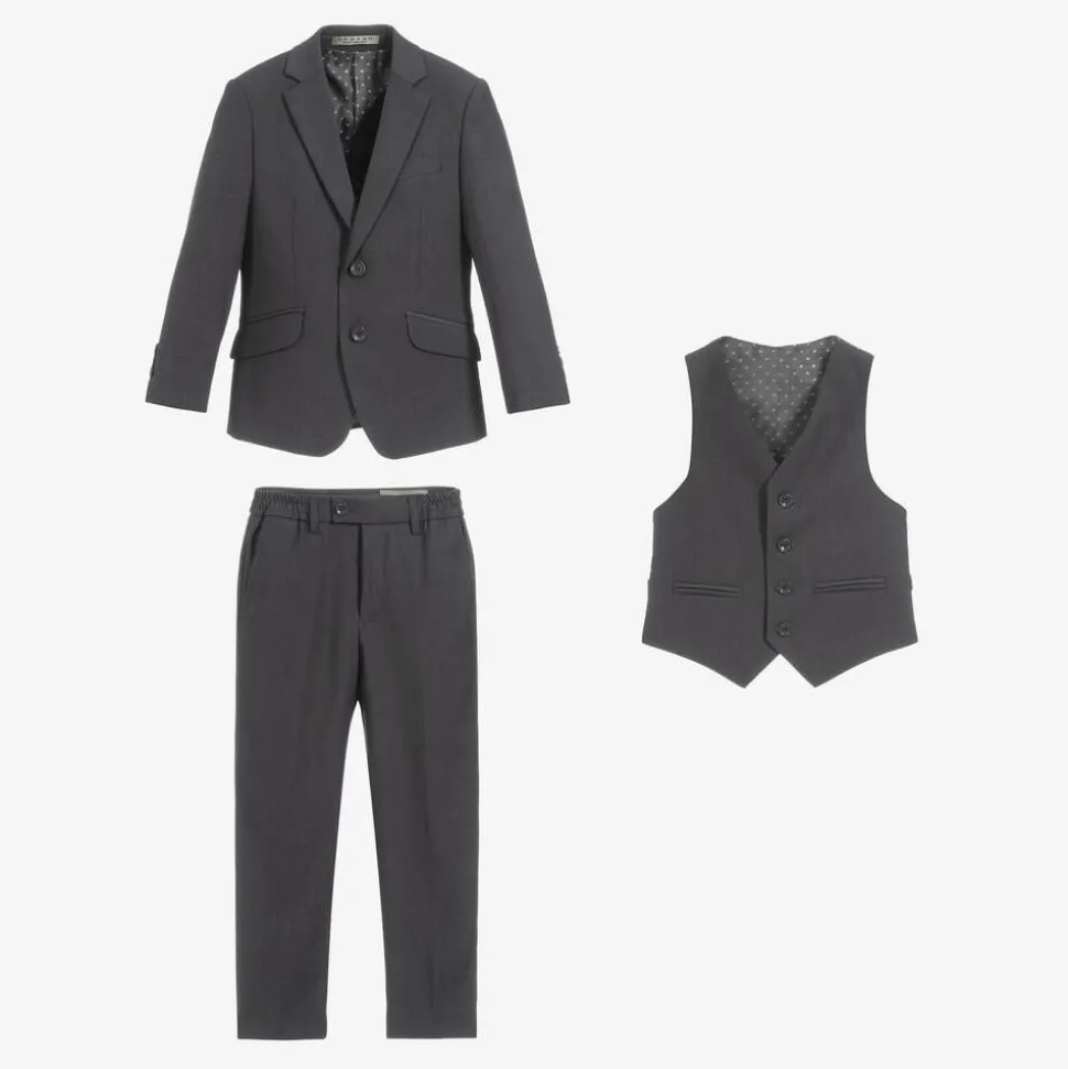 An elegant three piece grey suit for boys by Romano. Made from a soft, mid-weight viscose blend, the smart waistcoat gives a smart look to accompany the trousers and jacket. For a comfortable fit, the trousers have an elasticated waist on the smaller sizes and an adjustable waist on the larger sizes. The wide age range available makes it perfect for pageboys.