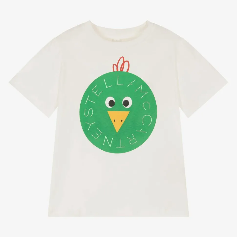 White organic cotton short-sleeved t-shirt for boys by British brand Stella McCartney Kids, made in comfortable jersey. Full of festive fun, it has a green Christmas bauble printed on the front, with a chicken face and the designer's circular logo. The Stella McCartney fit can be quite small so choose a size up if you want room to grow.