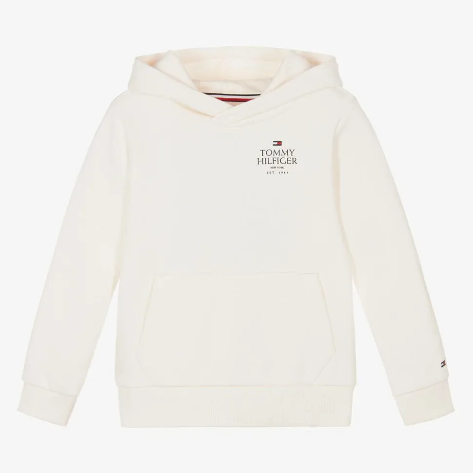 Casual ivory cotton hoodie for boys by American brand Tommy Hilfiger, made in soft, comfortable jersey, ideal for relaxed days. It has a useful pouch pocket on the front, neat ribbed trims, and the designer's iconic flag logo embroidered in red, white and blue on the chest and one cuff. Coordinating logo tape can be seen on the inside of the neck. This sweatshirt is made with at least 50% organic cotton.