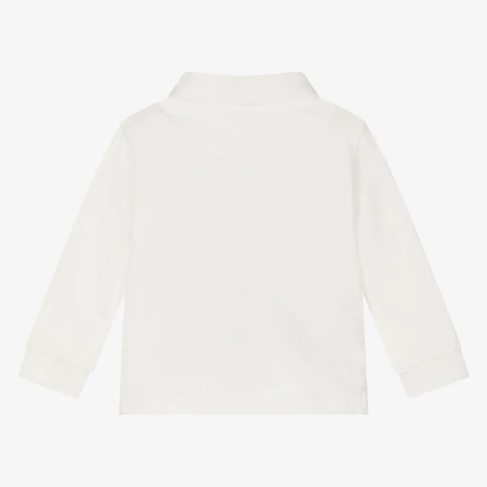 Ivory cotton polo shirt for little boys by Mayoral, with a cute bear face design on the chest. It is made in soft and stretchy jersey, with ribbed cuffs on the long sleeves, and side vents. It fastens with buttons on the front.