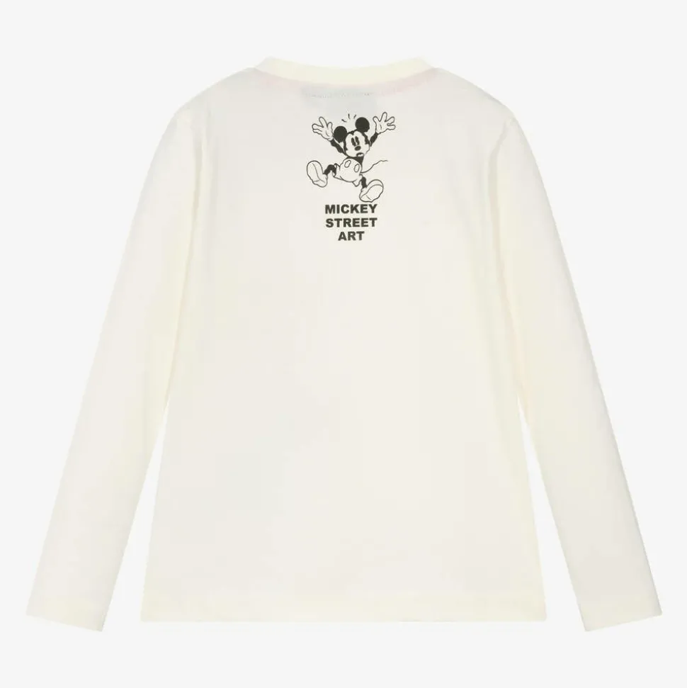 A long-sleeved ivory top for boys by iDO Baby, made in soft cotton jersey. This Disney top has an art-inspired graphic on the front, featuring Mickey Mouse and bold graffiti-style lettering. Another fun character print can be seen on the back. Smaller sizes have poppers on the shoulder for easier dressing.
