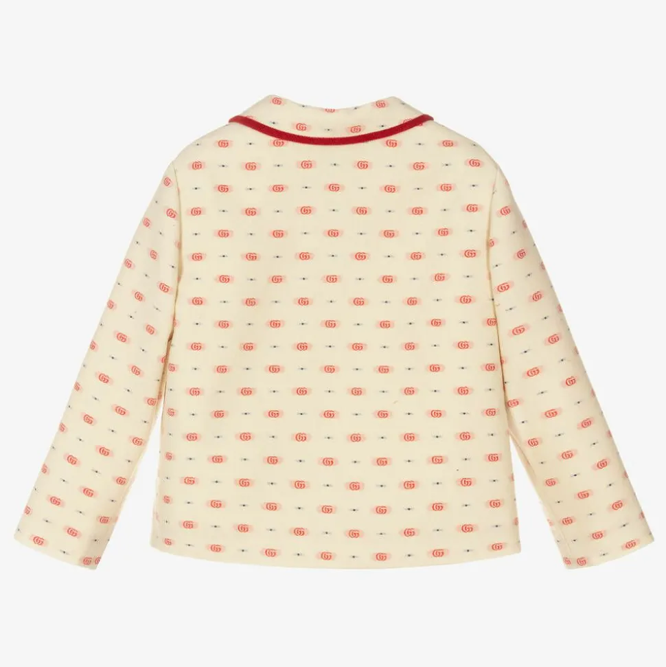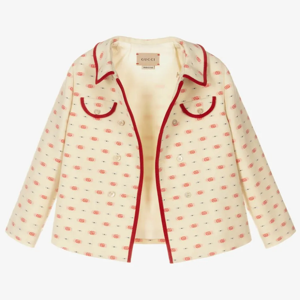 Ivory jacket for little boys by Italian luxury brand Gucci, crafted in beautifully soft, brushed wool. Achieve a timeless look with this classic jacket trimmed with red velvet piping and double breasted logo embossed buttons. It encompasses the brand's iconic GG logo design in a jacquard pattern all-over, with navy blue polka dots in a blurred style.