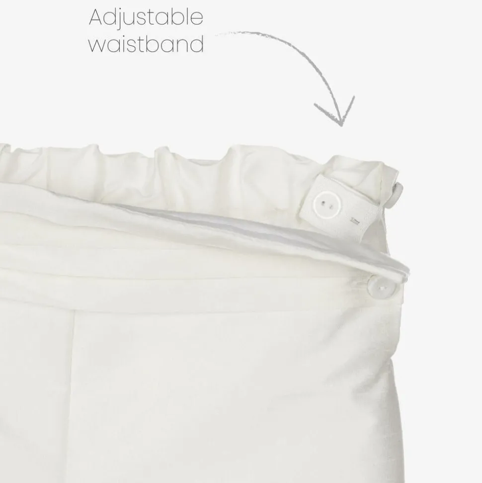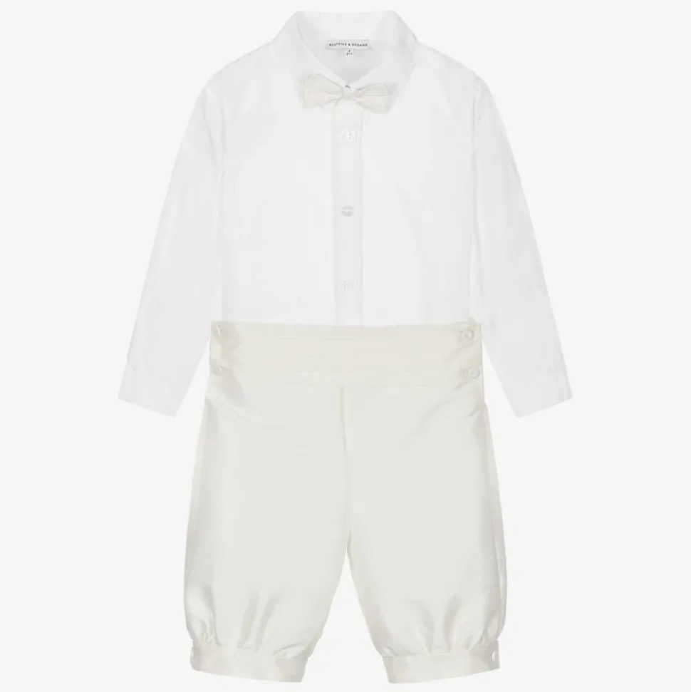 Traditional knickerbocker shorts set for boys by British brand Beatrice & George, exclusive to Childrensalon. Ideal for a special occasion, the white cotton shirt has a detachable, silky pale ivory slub dupion bow tie, with matching piping on the placket and logo button fastenings. The coordinating pale ivory knickerbockers have smart pleats on the front and button-fastening cuffs. They are fully lined for comfort and have a useful adjustable waistband that fastens with buttons on the sides.